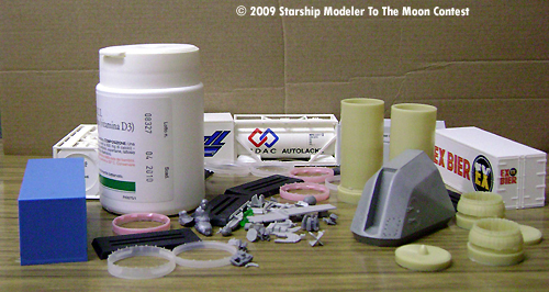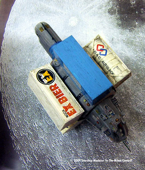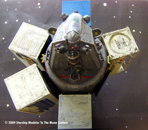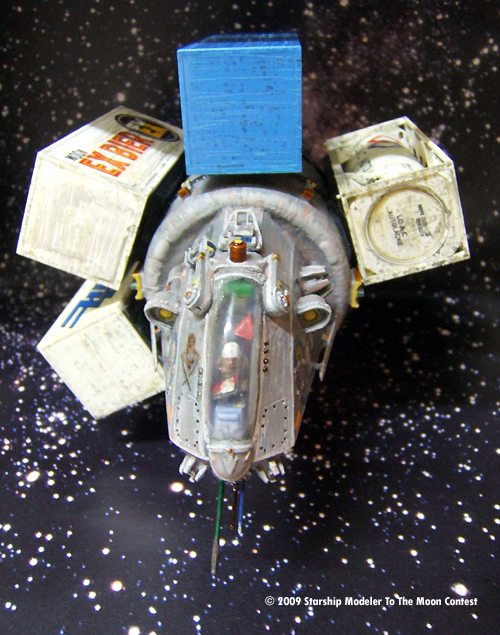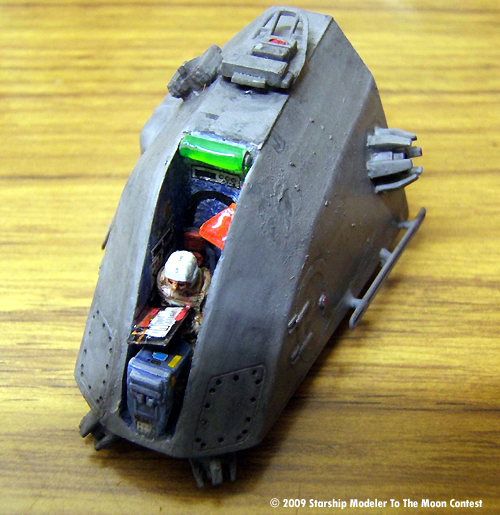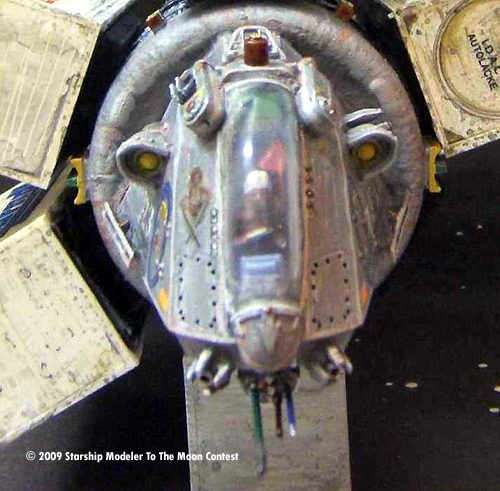 The exhausts on the back are two pieces in resin taken from a modern airplane kit and the antennas system on the front (as a communication transmitter- receiver...) is made by means of some remaining plastic parts and half a barrel from accessories in 1/35 ( just under the space pod).