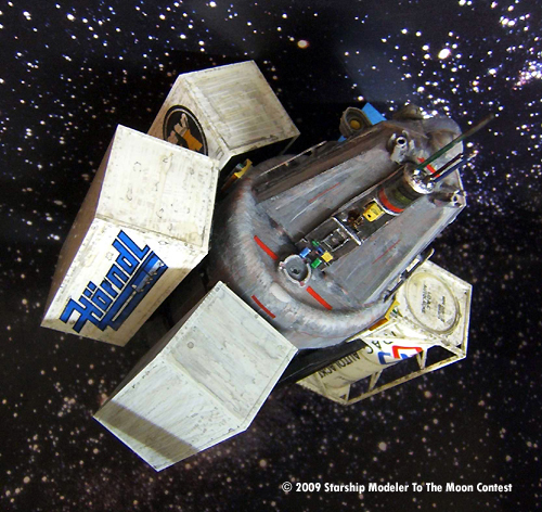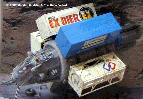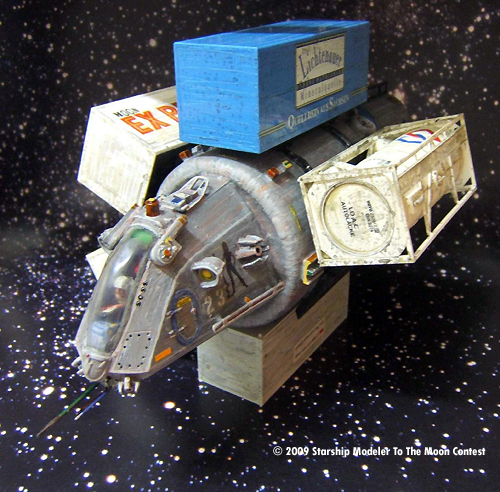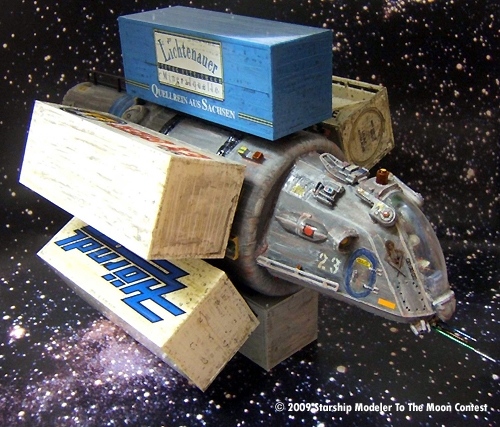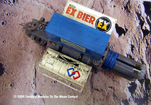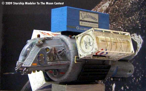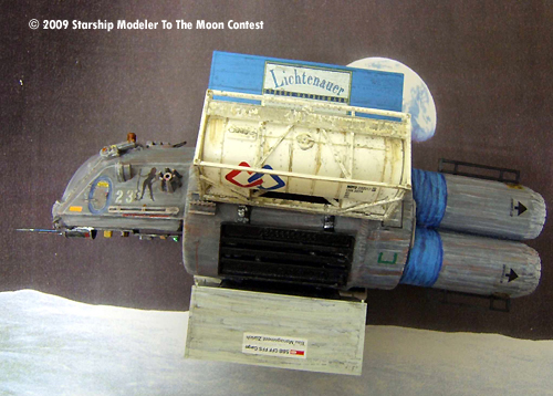 The vehicle, given its fictional shape, is meant not for direct Earth ground-orbit travel, but only for space take off from Moon ground platforms to get to space stations around Earth, whence the containers would be eventually shipped -via orbital lifts- to several surface transport systems."