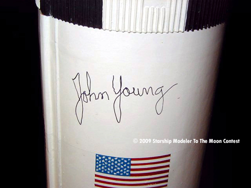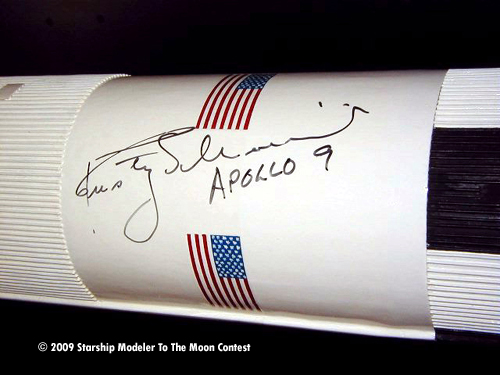 During an international conference in Geneva in 1997 I met Rusty Schweikart who was a member of the US delegation. He kindly accepted to sign my model. In late 1998 The model was exhibited in the Cite de l'Espace space museum in Toulouse, France for the 30th anniversary of the Moon landing. The exhibition was opened by John Young who also kindly accepted to sign it. For about a year the model was exhibited along the N1-L3 soviet Moon launcher which I also built at the same scale.
