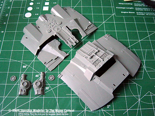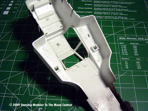 First, any obstructive parts were cut off using a Dremel cutting wheel. The cab roof was also cut off. Once that was done, I set out to dress up the interior of the cabin and the void where the chrome-plated rear engine on my dune buggy used to be. Parts from an Eagle Transporter (you know which part) and most of the surface details of a cannibalized Galactica Raider were used to do this. I think the surprise fit was the Raider nose piece, which fit almost perfectly as the dashboard. It even offered a place where the steering wheel could go!