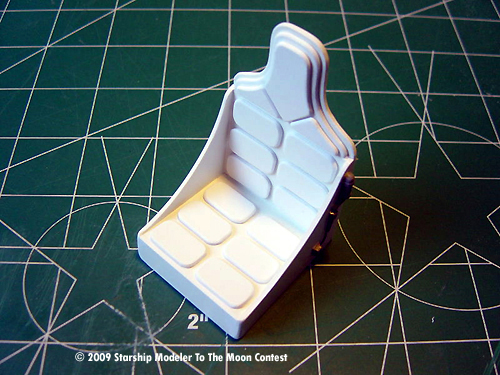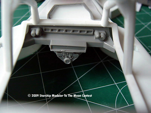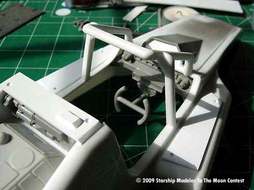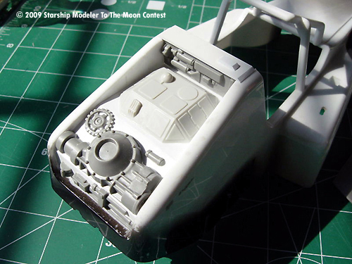 Once everything was done, parts were primer coated, then painted flat white. To lightly dirty up the vehicle, it was sprayed lightly with semi flat black. To add a very small touch of color, a moonscape was printed and attached on the vehicle's Heads Up Display.