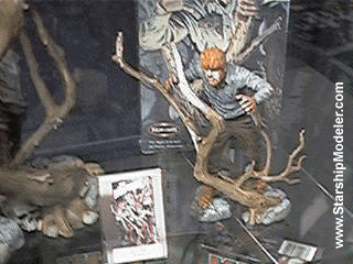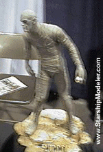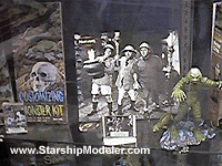 Intermountain Railway had their International Space Station and ISS Flight 2-A kits on display. The ISS kit will be ready to ship in 4-5 weeks, and you can get it with or without the decals already applied. There's a photo-etched brass "super-detailing" set available as well - a good thing, as the basic kit's booms are solid plastic with raised girder details. Solar cells are pre-printed paper ... and don't look bad, but don't look totally convincing either. Estes had some cool rockets, for those of you who like that sort of thing. They have a flying 1:35 scale Mercury-Atlas kit already out, and a really funky "alien socket ship" with spring-loaded legs coming soon. They're also re-releasing the flying Saturn V early next year. Quest had some really neat rockets on display, including their flying UFO and Enterprise-E kits. I am ashamed to say we forgot to ask about any new releases from Toy Biz in their comic book heroes lines. Volks is getting into the injection molded arena with a new line from Five Star Stories. If you've seen their other lines, you know they're renowned for exquisire resin casts of mecha, scantily clad fantasy heroines, and ghouls. The sprues we saw were just as nice - the detailing is tremendous! Four kits are to be released - Patraqushe Mirage, K.O.G Over the 7777, K.O.G Joker 3100, and a Burster Launcher. Geometrics had an impressive display of monsters, Aliens and Predator figures. Their studio-approved line are some of the best sculpture we've seen (Ripley is the first weI've seen that actually looks like Sigourney Weaver, for instance). New for the upcoming year are Aliens customizing sets - including 2 eggs (one hatching), Face hugger, and toolkit - and a deluxe base. There are new customizing sets for their Predator figures as well, including a skull with spinal cord, different head, and metal spear. Also new in the 50's monster movie figures are a resin Mummy figure (just out) and Frankenstein. They have also released a line of small, 3" resin figures which look good. |