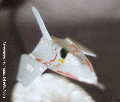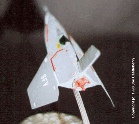 The model is a Vindicator- class Star Fighter. The SFV on the wings of the prototype stand for "Star Fighter Vindicator", inspired by the ship in John M. Peters' Science Fiction Sound Effects Library produced by The Hollywood Edge. The model is a kit bashing, constructed from components of an SR-71 model kit. |