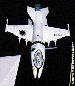 The category is scratch-built, scale is 1/48, the fighter is the RF-128 from Traveller. This fighter was the one that any Traveller player should recognize from The Rebellion Sourcebook, or the Azhanti High Lightning campaign boxed set, or the new GURPS Traveller. A buddy of mine (Bryan Gibson) told me that Rob Caswell & Tom Peters were behind the illustration in the Rebellion Sourcebook. (Your buddy's right - Ed.) It's constructed from styrene sheet (the wings & rudders), a hard-to-find tapering piece of PVC, the nose of an F-104 Starfighter, and the 'training' canopy from the old Testor's Stealth kit that caused a Congression uproar. |