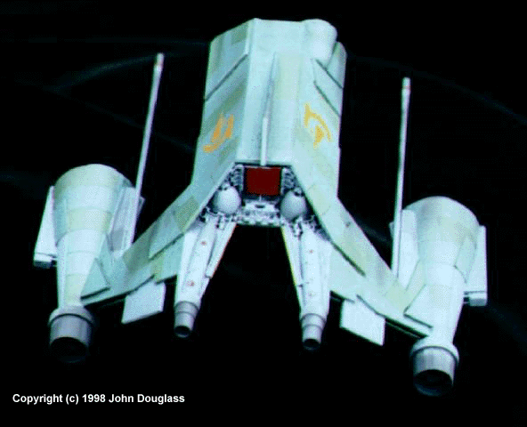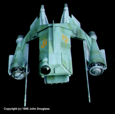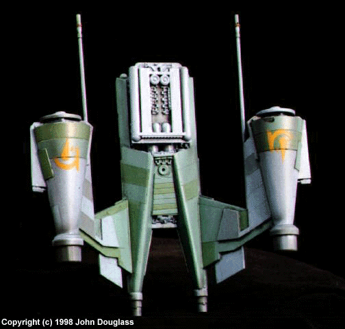I swear I didn't know it was a winking frog until I painted it green. Well, yeah, I knew it was winking (because I couldn't find a cockpit design I liked for it, so I offset a standard dome shape), but my major influence at the time was something else entirely! It started as a "V" shape with a trapezoidal box that I'd mocked-up as the basis for another of my "component ships" components, but never finished. I then chose plastic "megaphones" for the engines, as they were a little more intrinsically interesting than mere cylinders. To attach them, I used layered plasticard (for strength). At this point the major influence on the design, especially as I attached the extra long gun barrels, was Japanese animation. And up until I attached the guns, I didn't know which direction I wanted the ship to go. In fact, I was actually leaning towards making the front be the other way, because it would make fitting an engine exhaust easier, when I saw how well the guns fit where I put them. From that point on, the direction of the ship was decided. The major design considerations after that were, "What kind of excuse to use for having these big thingies hanging off the wings," and, "Where' the engine(s)?" I could have built a ribbed cylindrical engine protruding above the "V" shape, but I wasn't comfortable with calling the wing-end cones "gun-components", so they became the engines. The "V" ends became auxiliary engines (hyper- vs. normal-space? Sure, why not). It would have been too easy - and boring - to slap domes onto the front ends of the cones, so instead I used "non-strategic materials" (tank wheels - You bet I've got a ton of'em) to build something that in silouette eclipses the same shape as a dome, but is much more interesting. The choice of colours was dictated by the levels of paneling - I thought it would make a two-colour scheme easier to apply. So, for the two colours, I went with "Southwest Style" green and purple pastels. It was after I applied the green and before I applied the purple that I saw the frog. Honest! |
