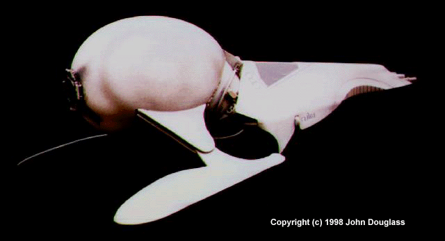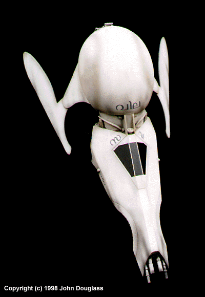 I was jealous of a Floridian modeller (you know who you are), who's construction method insurred an organic look. I had also seen fabulous "ship shapes" in museums - animal skulls - and decided it was time to try one. I started with a 'Leggs-egg cranium, which I sanded-off a section of, where I attached another sweetener bottle top, to which in turn I attached triangular cross-sectioned beak. I sanded-out the nose and a section along the sides just to make it more interesting. And I'd hoped the pointies in the nose, along with the protruding guns, would reinforce the nostril-opening look of skulls. The other defining "This is what makes a skull a skull" shape to put in was cheek bones. I had a heck of a time designing an excuse to have cheek bones, electing eventually to make wings that from only an angle looked like they rejoined the skull. The paint scheme was selected to again reinforce the bone-look, though, had the ship cow-horns, I could have painted it Southwestern Blue and decorated it with oversized Indian-like symbols. Hmm... may yet, too... |