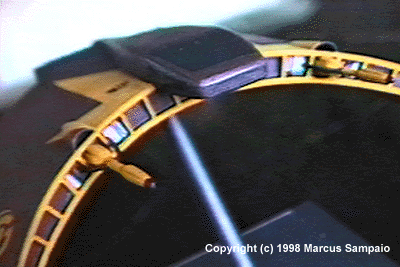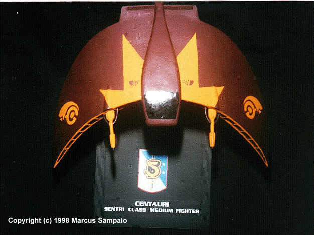 In the Babylon 5 universe the Centauri Sentri Class Medium fighter is a high-speed attack ship that is capable of both atmospheric, and non-atmospheric combat. It is powered by a fusion reactor based on the M/A-M converters used on the Centauri capital ships. This class of fighter is as fast as an Starfury fighter and, despite it's atmospheric wings, is surprisingly maneuverable. This figther first appeared in Season 2's "The Fall of Night", and when I saw it I fell in love immediately. I took about 3 months to complete this project. I had some difficulty because this was my first scratchbuild project.I used no parts of other kits, just plastic, balsa wood, wire and epoxy. In the rear I used 4 yellow LED's to simulate the engines. |