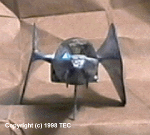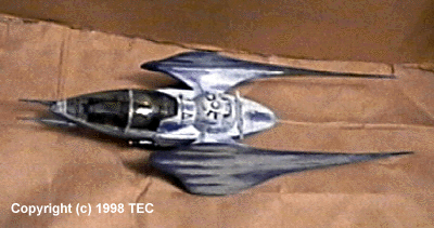 This model is of a Human-Minbari hybrid fighter designed for the InterStellar Alliance from Babylon 5. Class name: Tigershark. I scratchbuilt it mainly from: SeaQuest Stinger, and parts from: USS Wisconsin, TIE Interceptor, USS Enterprise D model stands, a Cylon Raider, unknown aircraft model and sheet styrene |