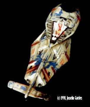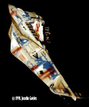 As Josselin tells it: " I created the Espadon ("Swordfish") out of the remains of an old Testors/Italeri 1/48 scale Stingbat Helicopter - yes, I'm sure you can see its shape under the whole thing - a few kit bits that came out of my spares box - don't ask me where they came from, apart from a 1/72 scale Apache helicopter - and of course a lot of Evergreen plasticard. The panel lining was completely re- engraved. The most interesting stage on this model was the painting. Three different layers were airbrushed : white, blue and light grey. I then had to get my best X-acto and a lot of patience to scrape the paint in a judicious way. I also used 400 wet & dry sandpaper - used dry - in some places. The remaining weathering was done with pastels. This ship is part of a diorama - which you can see at his home page. |