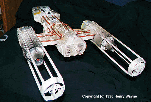 The Y-wing was built using photos from the movie that have appeared in different publications. It is basically made from a few of the same kits that constructed the originals that appeared in Star Wars: A New Hope: two Airfix Saturn V rocket kits, old Leggs containers, and a Tamiya Panther tank kit, to name a few. The main section is a frame with sheet plastic applied. Then hundreds of bits of models, Plastruct tubing, and anything I could find make up the detailing. I vacuformed the cockpit and scratchbuilt an interior. The pilot came from a Snowspeeder model. The kit is about the same size as the movie original and has a mounting post located in the bottom. |