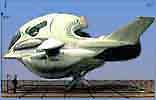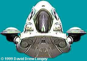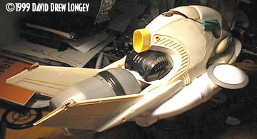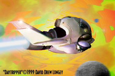 The body has been built up of cut bleach bottles and evergreen styrene sheets that has been heat-stretch molded around parakeet feeders and model battleship hulls. A Haagen-Dazs container and the back of a battery-powered robot's head make up the main engine. The back panels from an old car model make up part of the forward hull. I like to think of it as being a beautiful old secondhand rocketship that has seen better days, in the garage being "restored". I had to think of a name for it, and "Daytripper" happened to be synchronous with stuff that was happening, so that's what it's called. It's function would be that of a kind of souped-up old interstellar space boat for hotshots who like to tinker. Just the right vehicle for a film....