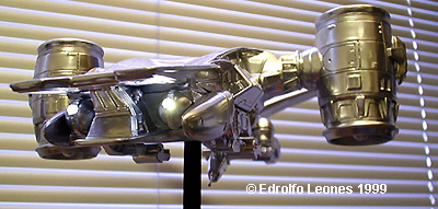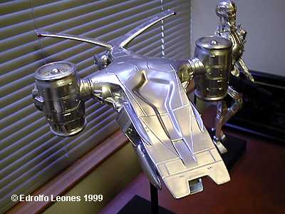 This is the vinyl model kit that is well over 14" long from Screamin' Models. The original design is relatively simple yet elegant and makes it one my favorite space ships even though it had only a few shots in Terminator 2. There are at least five coats of chrome spray paint along with blue LED strobes on its underside and two white LEDs for its search lights. I experimented with just about every type of silver paint on the market and was about 1 decision close to going as far as recasting the parts myself in resin and then using a new home chrome-plating process I came across This "Electroless Chrome" kit requires you to dip the piece in a stove-top boiling solution which would have made the vinyl melt and deform. I may use the product for a future project that can handle the high temperature. I finally found the best and least expensive solution using Krylon Chrome spray paint. I had to prime coat the vinyl model to keep the Krylon spray from eating the plastic. After about 5 or 6 layers, it gave off a pretty good quality metal finish as you can see by the photos. I still wish, however that I could have chromed the kit... >sigh<. You can see more of Edrolfo's work at his home page. |