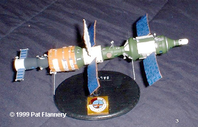 At top right is the Mir space station in 1/144th scale. It was made by combining the Monogram Mir model with the photoetched parts from the Realspace models Mir kit. The Monogram Progress module was modified to correct it's shape. Below the Mir is a scratchbuilt model of the Soviet "Luna Korabl" Moon lander in 1/48th scale, It is made from fishing bobbers and other odds and ends, and sits on brass tubing landing gear. The Cosmonaut figure is a modified Monogram "First Lunar Landing" figure. Close-up Side View This photo shows a model of the Salyut 1 space station in 1/144th scale. It was made from the core module of the Realspace Models Mir space station. The solar arrays are made from Evergreen Sheet Styrene pre-cut into a "tile" pattern.The Soyuz docked to it is a combination of Airfix and Realspace Soyuz's. The model is 6 inches long. This photo shows a model of the Salyut 3 space station (also known as a "Almaz" station.) It was difficult to find information on this station,as it was a military design and carried a Nudelman 30mm recoilless space cannon on the end opposite the docking port. My model was made from one of the refueling modules from the Monogram "Armageddon" station, and has a modified Soyuz from the same kit attached. It also is in 1/144th scale and is 5 inches in length. This photo shows a 1/144th model of the Salyut 7/Cosmos 1443 assembly. The Salyut is made from the core module from the Monogram Mir station, and the Cosmos space tug from one of the subsidiary modules from that kit. Once again the solar arrays are Evergreen sheet.The model is 9 inches long. |