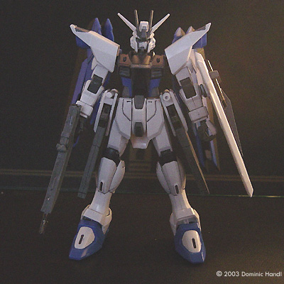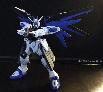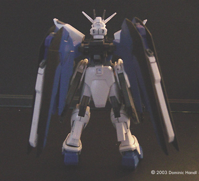 I have always liked watching the Gundam show on TV. Just wait about 5 minutes and something is bound to happen. There's a lot of action: seeing an enemy Zaku sliced by a Federation Mobile Suit's beam saber or blasted by a beam rifle; or four colonies taken out by a single beam discharge from the Gundam Wing Zero's buster rifle, in the Gundam Wing series. Gundam Seed is the latest series in the Gundam universe, with a fast-growing popularity. The Freedom Gundam is one of the newest models, from the Gundam Seed series. "Freedom": a good name for a Mobile Suit. Its design looked pretty neat, something like the Double X Gundam model back in the late 90's or Gundam F-91 parts put together to make this new design. It caught my eye and I just couldn't resist. This is my second Gundam Seed model and my first 1/144 scale model. The model has the same format and detail as the High Grade Universal Century (HGUC) line of models. Inside the box with the nice artwork are four sprues of parts, all molded in their appropriate color, plus one sprue of poly-caps for the joints. There is a sheet of foil stickers for the markings, plus instructions and paint guide in a small booklet. I once thought that a model this size was too small to handle. That part is not always true. With a lot of time and a good amount of work, even a model of this size can be made to look real. I opened the box and laid each sprue gently on the table and lined them up. Looking closely at every piece, I just shocked me to see how much detail can be on a kit of this size. Amazing, eh? Well, that's Bandai's standard of quality. All the pieces were accounted for and no flaws found. I was ready to go. Painting and Detailing I like to paint the pieces while they are still on the sprue. This kit is already molded in color and can be assembled as it is, straight from the box, if you like. But I'd like to make this model as real as possible. It would take a lot of touching up and detailing to do that, but that is all part of the fun. At this point I only detailed the major parts. I painted more during the assembly. My idea was to make the model look more like it was used for military operations. I did not use the sticker sheet because it makes it look too toy-like. All that red color makes it too showy. This Gundam was designed for battle so my intention was to make it look like it was used only for that purpose. First, I went over the panel line details with the fine tipped pen, then wiping off all the excess ink that got on to the surface of the model. This accentuates the detail. I had to do touch-ups on the tips of the plasma cannons. I painted these a steel/burned iron color. I painted the part of the top of the shoulder armor where the red foil decal was supposed to go a neutral grey color. Then I turned to the beam cannons. One part of the barrel was already molded in sort of a dark blue color so instead of red stripes, I changed that to a neutral grey color. The center, red part of the shield I changed to a medium blue color. Building First I took everything off the sprues with the scissors on my Swiss army knife, going close to the pieces and cutting them off. Then I used a hobby knife to scrape any remaining stubs on the on the pieces. Then with a metal file, I sanded each piece smooth, after which I wiped off any dust with a wet paper towel. To make things easier, I then put each piece in Ziploc bags and labeled them according to each sub-assembly ( Legs, Arms. etc. ). |