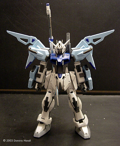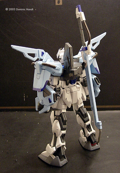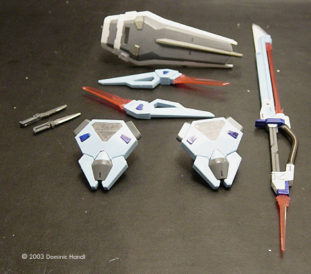 Bandai has recently released the second version of the HG 1/100 scale Strike Gundam: the Sword Striker from Gundam Seed. According to the story, this system is for the Strike Gundam in close combat situations, using mostly a variety of bladed weapons for battle. The Kit The kit is made up of nine sprues of parts, one sprue of poly-caps for the joints, one sheet of foil stickers, and an easy-to-follow fold out assembly guide. The model is made from a high quality injection plastic, having very crisp details throughout. It's a snap-together model. Preparation The first thing I had to do was check to see if there was anything missing or broken. I took every sprue out gently and checked to ensure all the parts were there. The kit was complete. There were no flaws. I was ready to go. Cutting each piece off the sprues and trimming excess flash can be a very tedious process. A Swiss Army knife works well for this type of job. I always had one handy. With the scissors built into the knife, I went in as close as I could and cut the pieces off. Then with the main blade, I scraped off all the little bits of left over flash. Taking a steel file, I sanded each of the pieces smooth, then put them in plastic bags which I had labeled according to each of the sub- assemblies. Painting and Detailing I did all the major painting before assembly. I've noticed how gaudy the color scheme of most of the Gundam models is, making them too showy, not as if the machine is intended for military use. I didn't really like how this thing looked, so I had to change that a bit. The red parts, I painted in a neutral grey color, brushing the paint on by hand. Then later during the assembly, I touched it up where it was necessary. For the details, I took a micron pen and just went over the panel lines. The black color brings out the detail a lot more. Building the Warrior Like every Gundam model, this kit was designed to be done in sub-assemblies. The manner of assembling the main body was like a previous model I made, the Aile Striker Only this part is similar. The other parts are different, especially the shoulder armor and the sword rack that goes on the back. The model as boxed had the shoulder armor only on the left side. I didn't like how that looked, so I decided to put it on both sides. I had an extra kit especially for this purpose. I didn't use the cable parts that came with the kit. Instead, I used a Wave 4.0 A-Spring option part. To install it, I cut the ends off the cable pieces with a pair of sprue cutters. I was going to use the ends so I kept them. Then, I took one A-spring and measured it to the length of the cable pieces. I cut them in four pieces and put the cable ends I cut earlier on each side of the A-Spring. Then I put one end on the front piece of the shoulder armor and put the other end in the corner. I did the same with the back piece. I did the center piece and put it on too. This part houses the sheath for the beam dagger. Along the edges of the armor, I touched up with paint. I did the forearms at this point, thinking I might as well do the whole arm since I was already doing the shoulders. One arm had claws on it. The other arm had bothclaws and a shield. I assembled the claws, which are a very straightforward assembly I tried the claws after I had assembled them, to see if they worked. They did, and looked neat - and even better with one on each arm. As designed, the claws were made to shot outward, attached to a cable. (or without, if necessary) The hands came together easily. The back cover of the hands made it look like the Gundam had a steel glove, which I thought looked pretty neat. I joined each to the wrist joints on the forearms I assembled earlier. The legs were designed to be assembled by putting the internal parts together first, followed by the outer cover. There were a few pieces to this assembly. I put the ankle armor and the knee armor on. Then I assembled the feet. Each had three pieces. For the ankle joint, I had to put a poly-cap in. I connected that to the legs. I then put the knees together, connected one end to the knee joints on the legs and the other to the knee joints on the thighs. The body had to be done in stages. I did the lower body first. Construction begins with two poly-caps to hold the side skirt armor to the frame. Each of the side skirt armor pieces has a scabbard for the knives this Gundam uses. A side cover opens for the knives to go in. After I did that part, I put the folded knives in their place. This is actually something I thought was a pretty neat feature. Then I put the back piece on. The sub-boosters on the rear skirt armor were painted a steel color. The front piece was actually three pieces: two side pieces which that form the front skirt armor and a center piece that holds the skirt armor in place.Next, I put on the lower back piece. It's a white piece that goes around the lower half. I put the upper half on followed by separate shoulder joint. Then, a collar piece housing the neck joint goes on the top. On the chest and back I put on what looks like roll cages. Finally, I put the backpack together. This part is the rack for sword. I did the head in different way. I first colored the recessed area around the eyes black using a micron pen. Then, I painted the eyes a metallic green color using a paint marker. It's easier for me to use than a small brush and it I was able to put the paint on better. For this model, I painted the face guard using a steel colored paint marker. I thought it would give it a better look. Then I painted the small “V's” that go on the head a metallic grey color. Next up were the weapons. I started with the sword which is pretty long. I connected the blade to the hilt,and then put on the energy arc, which was a clear pink piece that goes in the middle of the blade unit. The beam daggers were very easy to do, being only two halves. On the front, the blade - also a clear pink piece- goes on. It gives the appearance of be
