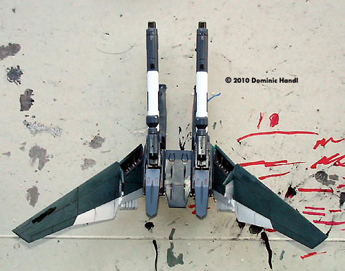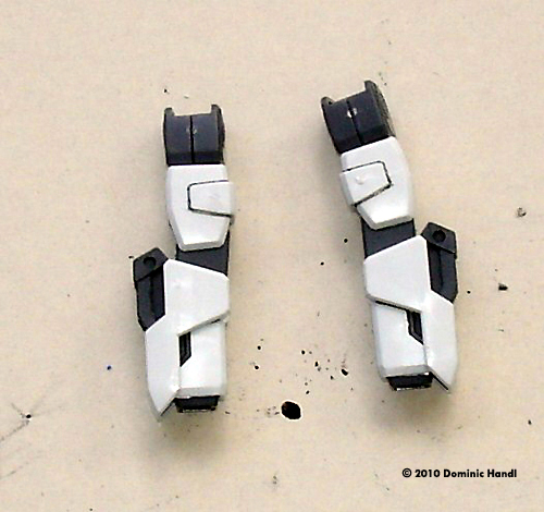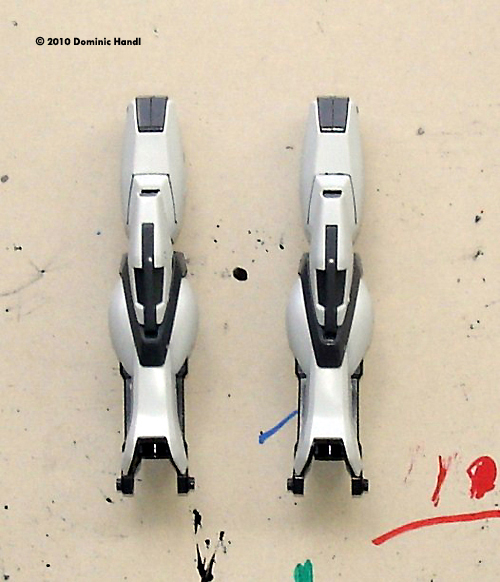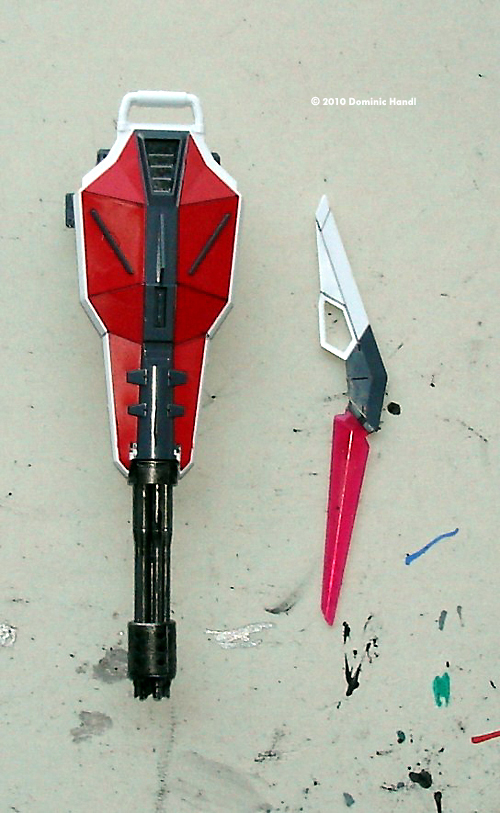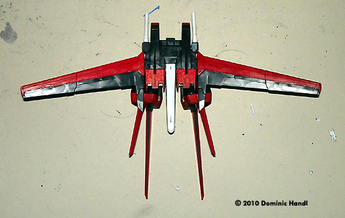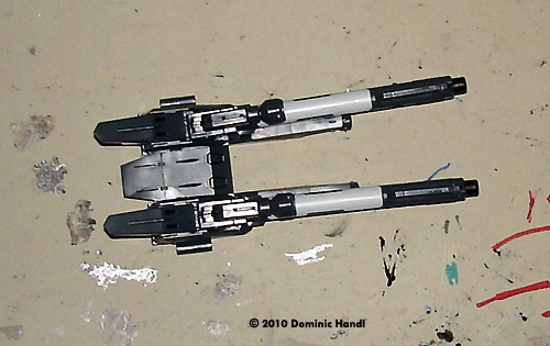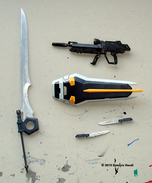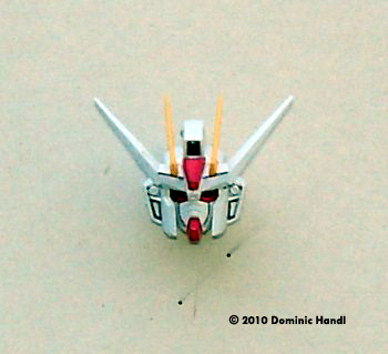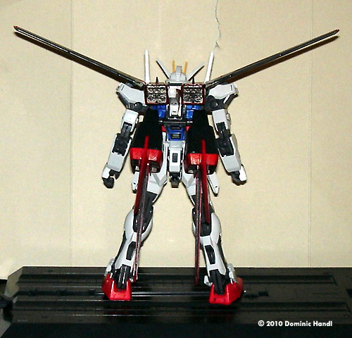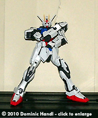 After I did that, I had a whole arm to do. First I had to do the elbow joints. I had to pay close attention to this part to make sure the poly-caps were in the right positions and that the joints worked properly after putting everything together. I tried the parts out a few times to see if they worked. Everything worked properly. The black weathering streaks look real good. Some of that will have to be covered. The outer coverings for the arms are shaped in such away that each piece fits exactly right and only for that particular part. I don't see anyway of making a mistake when completing the arms. I tried moving the arms with the cover on. Everything worked well like it did previously. I set those aside. The feet assemblies were very straight forward as well. I did a few touch ups on the details on the ankle joints and the feet. The legs are like the arms. I had to do the inner skeleton first. With the amount of pieces, it took me a few minutes to do the skeleton alone. The thing has movable knee caps. That's a pretty neat feature - an extra detail they added to this Master Grade kit. I had all the legs' outer covering already cut off the sprues. I just had to make sure what piece goes where; first the thigh covers, then the calf, then shin guards. All that weathering on the legs will also be partially covered like the arms. I tried the legs out a few times, even in a crouching position. I was impressed with the way this model did that. Then I put the legs aside, standing up and already connected to the feet. The lower body is one big piece with two halves and the hip joints in the middle, plus skirt armor on the back and front. On both sides are knife cases. After building this sub-assembly, I connected the legs, then the torso, arms, shoulders and head. The basic Gundam frame was already completed. I still had a lot more to do, though. Aile Strike Unit As mentioned earlier this part was not included in the kit, it was just extra parts I had from a previous kit that I decided to use for this project. Assembling the Aile happens in four stages: the top part, wings, mid-section and the lower boosters. The top section was a big piece, two large halves and the two boosters that go on to them. Before I was able to mate the boosters with the unit I had to put a joint for the wings. After mating the boosters with this top part I connected the wings, which are two separate pieces (the main spar and the leading edge cover, which was a long red piece that almost goes from in spars to the wing tips). The wings move. They fold pointing downwards then come up again to the fully spread position. I then mated the top half with the mid-section and put the assembly aside. The lower boosters were a bit tricky. The front of this part houses a joint that connects to the bottom of the mid-section. I had to do that first then put an end cap on. I had to make sure this was on tight so that it doesn't come off when I'm handling the model later on. Next, I had to put the vanes that stick out from the boosters on the boosters themselves, then mate them with the nacelle assembly. After that was done, I connected them to the mid-section and the Aile was complete. IWSP Unit This part came with the kit. There were a lot more parts to it than the Aile. The center of this unit, where the twin beam cannons are mounted, was the biggest part. Even with the beam cannons on, this part doesn't look like much. It's just a block, a square platform with two beam cannons on top. I weathered the white part that goes on the top of the beam cannon barrels a little. I just thought it looked good with some carbon streaks. The barrel tips I painted and streaked with some soot black paint over the gunmetal/ steel color. The center of the IWSP has two booster units. I left these as molded in white and grey. I painted the insides burnt iron, put a thin layer of soot black on, and installed the assembly onto the center unit. The main wings were comprised five components. I did the tail (the vertical stabilizers and the rudders) first, then the main wings (the leading edges, in spars and flaps). Next, I mated the tail with the wings. Putting those aside, I worked on the main engine assemblies: boosters, fantails, nacelle halves, and the intakes. The boosters - two on each side - I painted a thin layer of soot black on the outside. I did the same with the inner surfaces of the fantails. The intakes were white and streaked with some soot black, even along the sides of the intakes. The nacelle vents I painted in a steel color and streaked the area around them with some soot black paint. I mated the completed boosters with the wings and set that on the table bottom facing up. Then I went on with the bottom half. This part was pretty straight forward to do. It had grills on the front which I painted in a steel color. ThenI put the canards on, one on each side. Unlike the wings, which fold upward, they pivot downward. I had to put on two other pieces to connect to the bottom half of the IWSP unit. They looked like two sword racks. After that, I joined the two parts together, trying out each part to ensure they functioned properly. (They did). Okay, only a little bit more to go. Weapons The very first thing I did was put the gatling shield together, touching up the barrels and the tips with soot black to make it look like its been used a lot. Then I did the shield part. It is white with two red plates that go on either side of the gun assembly, which the shield is connected to. On the inside of the shield, a hard point connects to the arm. I put the grip on just behind the barrels of the gatling gun. A dagger-like energy boomerang went on the top in the center of the shield assembly. The beam rifle was straightforward to assemble. I only had to do some minor touch ups on that part. The twin swords looked like katanas. The shiny silver color gives it that blade-like appearanc. Most of the touching up I did on the grips before I mated the blades