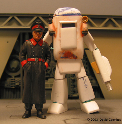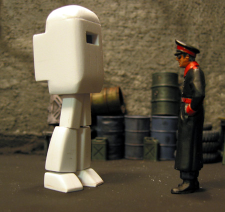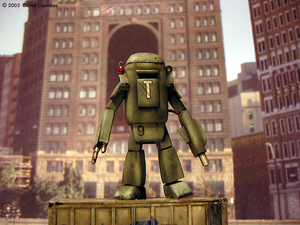 All of the cutting was done with a razor saw in a miter box. The components were then cleaned up using sanding pads to get them ready for paint. The joints were made by drilling holes in the solid parts and using short lengths of thin wire. This made the joints flexible which was key because I had no idea what the final stance would be. Also the legs probably aren't exactly the same length. The body was built in pretty much the same way as the legs, except that the body is a hollow box. Yes the lid can come off and there are a few details inside including the driver. Note that I was constantly the checking the parts to see if they looked cool. In the "Early Test" image you can see the legs look a bit too wimpy and tall. The arms were built in exactly the same fashion as the legs. I couldn't find a hand that looked good in my spares box so I ended up carving one out of styrene using a knife and files, which isn't as hard as it might sound. I wasn't brave enough to do two hands though, so it got a gun arm for the other one, just like Yokoyama-san's stuff. Construction ended with adding a bunch of little greeblies to make it all look cool. The shoulder pads are made from plastic spoons. I wouldn't bother again, the plastic was really brittle. The lights and guards over the shoulder pads are kit parts. I drilled the lights out before painting. I did some filling with Testors red putty. This is great stuff for contours and stuff as long as you don't care about getting a hard smooth surface, which I didn't because I wanted this thing to look like it was cast from steel. Paint and finishing All the paints are Tamiya. Firstly I painted on a nice thick coat of flat black to unify the surface. Then I used a greenish grey color for the base. I swirled it around and tried to do a bit of pre-shading. Then I added some white and again kind of pre-shaded. Then I added decals. All the decals are rub down, from the train section at the hobby store. I blew a tiny amount of the original color over them with the airbrush to tone them down. Nearly all of the weathering on this model was down with pastel chalks, applied dry with a brush. I finished off the weathering with some paint chips done with a tiny brush and thin black paint. Finally I filled the lights with clear epoxy glue to make them look realistic. I was done. Photography The final shot was taken against a back drop picture of a sky scraper with the "Nut' standing on a shipping container again from the model railway section of the hobby store. I did some Photoshop hackery to make it look vintage. Conclusion I'm pretty happy with what I've done. It's the most ambitious thing I've made to date, but its also really only a bunch of simple steps linked together so I think anyone could do this. |