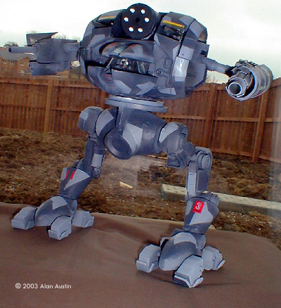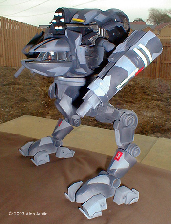 I drew some rough plans for the shape and size of the different parts to see how they would best fit, and then just dove in. >The major subassemblies are: head, torso sides, central torso, arms, hips and legs and I made it in pretty much that order.. Head I started with the cockpit. That let me see how to fit the Uziel's distinictve head assembly around it. The seat and pilot came from a 1/48th Apache helicopter (although the 'Mech is more like 1/35th) I made the head in four main sections shaped from soft balsa wood with sheet styrene formers. The central section was made from more styrene with detailed greeblies from the Apache kit the pilot came from. Torso Sides These were made from the usual balsa wood and sheet styrene. I decided that this was the best place for the weapon bays. The machine gun arrays were made from the 25mm guns found in Bandai's Gasaraki model kits. These are pretty cheap kits with alot of good parts including some nice ammo feed bits. I glued two feeds together for each side and routed them alongside a length of wide plastic tube to look like a hopper. I cut the barrel off each 25mm gun and replaced it with a set of three barrels made from more plastic tube - now it looked more like a rapid fire array. The guns were glued to harpoints swiped from an AH-1Z Viper kit, those in turn being glued to the plastic of the torso side. I built up the shape with balsa wood and plated it with more plastic. The doors were made in the same way but with more Gasaraki bits to make the hinges. I thought the doors would look better with support pistons so I made some with more evergreen tube (I use alot) for the cylinders and metal sliders for the pistons. The doors work perfectly and look great, the 'Mech can look as though its being reloaded. I knocked up some shoulder plugs with thick plastic tube (from adding machine reels) and 1mm sheet styrene. Other thicknesses of evergreen tube were used to make the arm supports. Center Torso This was pretty simple, although it supports the rest of the 'Mech and needed to be strong. It also held the battery pack and switch for the LEDs. It's a rectangular box a few mm narrower than the width of the head. It was made of thick balsa and was only plated on the top, bottom and back - superglue would hold the torso parts onto wood well enough. I made a torso twist ring using the amazing hole-cutting compass (I love that thing) and drilled a hole to support the hip's twist axle. The SRM6's body was a pepper container with a new fascia cut out of plasticard. Six holes and Six 48th scale hellfires later and it had a shiny new missile pod. |