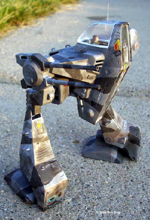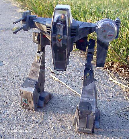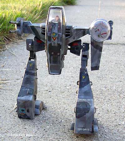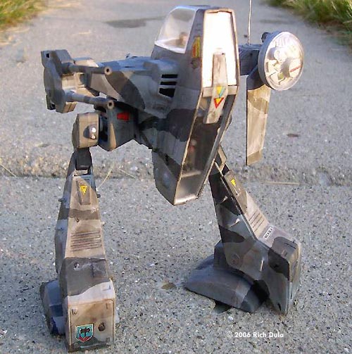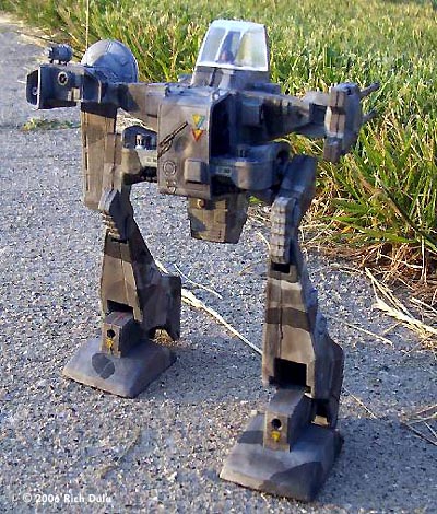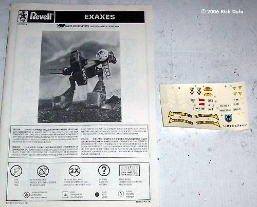 I had purchased a Robotech Defenders Exaxes kit on eBay in 2005, and the kit had been sitting on my stock shelf for some time, so I figured “what the heck” and decided to build it. Now, I should clarify that I have built this kit before, back in the 1980's when it was first released by Revell. That kit was a casualty of a BB gun war sometime around 1985, taking heavy impact damage before a lit M-80 was dropped right between its legs. What You Get As John Lester noted in his preview article about this kit, the Exaxes was originally the Ishform from Studio Nue's Super Dimension Century Orguss anime series. In fact, the Revell kit still carries the Orguss ID tags on the sprues, as well as the A, B, and C designations. The kit includes three primary sprues of parts that are molded in purple, one secondary purple sprue (with the instrument panels), one sprue of clear parts, and a sprue of 28 rubber polycaps.The Exaxes was designed as a two-man recon 'Mech for use in rough terrain. It is lightly armed, with a twin-barrel cannon mount on the right shoulder, and a large sensor dish on the left shoulder. Aside from the cannon, the 'Mech doesn't appear to carry any other weapons. The instructions that are provided are laid out in a 12-page booklet with 39 steps. The last step shows the placement of the decals. The decals themselves are fairly representative of those on most kits during the 1980's. They have lots of carrier film and are generally thick. A couple of the smaller ones were slightly off-register, but still didn't look too bad. The Build-Up For an older vintage kit, this one is not that bad. There was minimal flash on the parts, and some minor sinkholes. There were four main sinkholes that I encountered during construction, two that were on the exterior of the kit, and two on the interior. The first step in the instructions deals with building what is more or less the waist of the 'Mech. I immediately started painting the base color on the various parts prior to assembly. The actual engine section was painted with Testor's flat black paint and then dry-brushed with MM Chrome Silver. You have to do your detail painting before assembling the two engine parts because they slide into a circular section on the back side of the waist area. Once they are in place, you will have one heck of a time trying to paint them. Steps 4 and 5 are the first point where you encounter sinkholes. The exterior ones that I mentioned earlier were on parts B15 and B16, which are the lower brackets coming from the engine area and bending into the hip portion of the 'Mech. I assembled the parts as shown and attached them to the engine area. Then I simply filled in the sinkholes with some super glue and sanded the glue down flush with the surrounding surface. In Step 7 it isn't clear from the instructions whether parts B5 and B6 are supposed to be glued in place, or if they are supposed to be left loose. These parts act as the hip joint covers and cover the pivot points for the legs. I ended up attaching them with super glue and locking them in place, otherwise they were flopping all over the place and could (and did) slip off quite easily. Step 10 starts construction of the legs, and here is where you might need a Dremel or a small cordless drill. Steps 10 and 11 deal with building the knees of the 'Mech, and you will need some clamps to hold these parts together while they're drying. Likewise, you will also need the clamps during steps 13 and 15, when you are attaching the upper legs by positioning the parts with pins running through the parts assembled in steps 10 and 11. |