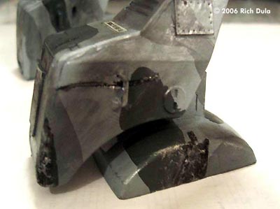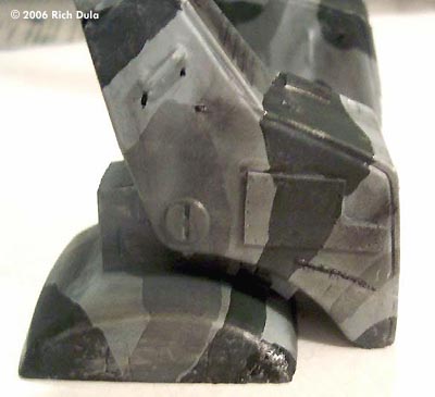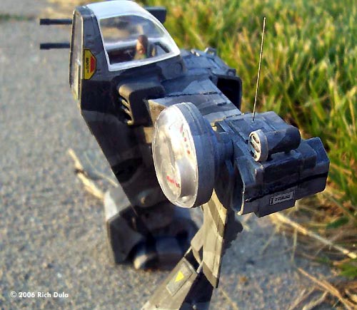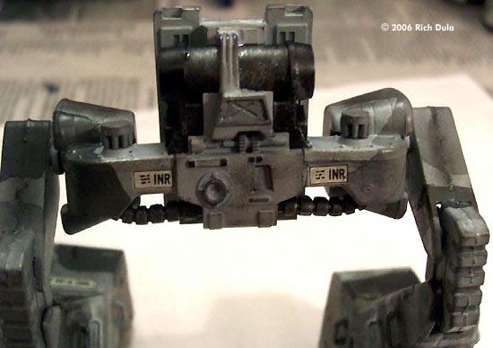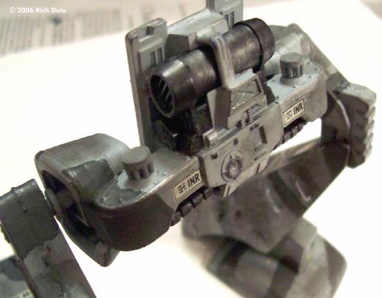 This is where your tools will come in handy. On a couple of the parts, the polycaps were not large enough to allow the pins to pass through during assembly, even though I was using the largest diameter polycaps provided with the kit. I ended up using a 9/64 drill bit to open the polycaps up a little bit after they were already installed in the knee halves. When you assemble the feet (steps 16 to 19), I highly recommend painting them before you start assembling the leg halves in step 20. The feet are attached to the legs via a two-point pivot near the toe, but it is difficult to reach some of the areas after assembly. While you are assembling the legs, it is best to glue the leg side plates into position, then let them dry before putting the cover plate on. Also, be careful in steps 21 and 23, as you have 12 small handles (part number A13) that are very easy to lose. I ended up losing one, but covered the holes with a patch made to look like replacement armor over an impact site. Step 25 shows installing the two crew members in their seats before installing the seats in the body sections. I left my crew members out until I had decided whether to use the seated figures provided or to use some other standing figures that I had in my parts bin. Step 26 begins assembly of the cockpit, and this was where I encountered the two interior sinkholes that I mentioned earlier. They were on parts 24 and 25, which are the cockpit panels. Fortunately they are located at the bottom of the panels, which are flat, so you won't have to worry about removing any detail areas. As before, I simply filled in the sinkholes with some super glue and then sanded the areas. I did have to use my clamps to hold the panels into the body sections while they were drying to prevent the panels from bowing inward toward the seats. This is where I deviated from the instructions a little bit. The cockpit area is set up as a dual cockpit, with the pilot's chair up in the head of the 'Mech, and the crew in the lower torso. There is a large open space under the lower crew seat, and I didn't like that. I looked through my parts bin and came up with the forward landing bay from an old Ertl Imperial Star Destroyer (about ¾ inch square). With all of the wiring molded on the part, it looked perfect for an interior panel. I painted it, gave it a little dry brushing, and installed it in the cockpit. I decided to skip 27 (cockpit window installation) until the end, and went directly to step 28, which involves attaching the back of the 'Mech. The problem is that you have to paint the inside of part C1 or you will see purple inside your 'Mech when looking in through the cockpit windows. I clamped the body sections together and let them dry for about a day. I also attached the cannon mounts at this point (step 37 - parts C19, C12 and C13), and the sensor pod (step 32 and 33 - parts C11, C10, C5 and C6) so I could see if there were any gaps and to make painting of the shoulder areas easier. I did find one large hole in the upper rear section of the left shoulder, which I patched with some sheet styrene. It almost looked like a mounting point hole that had been incorrectly cast, but according to the instructions there wasn't anything to be attached at that point. The only other change that I made was a substitution in step 36. I didn't like the part supplied by Revell for the antenna (part C14), so I clipped the antenna off at the base, installed the base in its location, and after it dried, used a pin vise to carefully drill open the center section. I then used super glue to attach a short length of guitar string for the antenna. I won't have to worry about antenna breakage later. The only real problem in terms of fit is with the bottom window at the front of the cockpit. Depending on how tightly you clamped the body halves together during assembly, you might have to sand the sides of the window down in order to get it to fit. I used a No. 11 blade to shave some of the window down, and then evened it up with a sanding stick. After repeated dry-fitting, the window finally fit. The top window fit without any alternation. The last major assembly was painting the crew figures and putting them in. I decided to use the supplied figures and add additional ones outside the 'Mech later. I painted the uniforms MM Rust, detailed with MM Interior Green and Testor's flat black. The flesh tones were painted with Acryl II Skin Tone Base and carefully dry-brushed with Skin Tone Warm Tint. Detailing I decided from the beginning that the last thing I wanted to build and display was a BarneyMech, so I started looking into alternative paint schemes. I settled on using a triple-gray paint scheme for an urban recon 'Mech, with MM Lt. Ghost Gray as the base color, and varying sections of MM Dk. Gull Gray and MM European 1 Gray. The cockpit was painted MM Lt. Ghost Gray, and the panels were painted flat black. I used various paints to simulate the instruments, and then dry-brushed the panels with Chrome Silver. I wanted this to look like a 'Mech that had been in the field for a while, so it's pretty dinged up. After I assembled the major sub-parts, I attacked them with my Dremel to show damage. Nothing major, but some dents, scratches, impact craters, that kind of thing. I painted those sections flat black to make them stand out a little bit. I also attached patch panels made of sheet styrene to various points around the 'Mech. After I glued them in place and let them dry, I chucked a dressmaker pin into my pin vise and used it to simulate rivets in the panels. I went around the outer edges of the panels, and sometimes through the center on larger panels. For the decals, I used a paint brush to apply Future only to those areas where a decal would be placed. I applied the decal, and then sealed it with more Future. I touched up any areas that needed it, and then dry-brushed with MM Chrome Silver over the whole 'Mech, picking out details as I went. I then used a Q-T