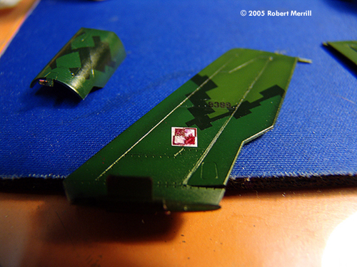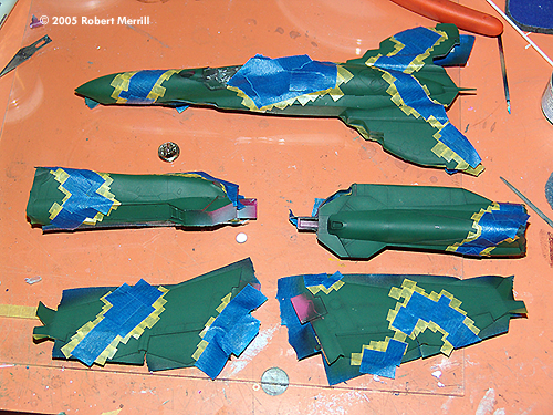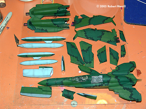 Gonna need a lot of tape.... Then came paint. Remember that hard edged angular Soviet scheme I talked about earlier? It got changed to a three color green ground attack scheme. Oh boy was this fun. The painting process proved my love for Tamiya's masking tape. Four layers of masking & no pull-ups. First I masked off the intake trunks & landing gear bays to protect the white. I used foam, masking tape, & Parafillm-M. Then I pre-shaded dark blue followed by the light blue on the underside. Then that got masked off using more masking tape. When pre-shading multicolor camo I run the reverse of what's normal. So the first color I laid down was the dark green, then more masking, then the medium, more masking, then finally the light green. Lots of tape. And not a single pull-up (boy do I love that Tamiya masking tape). The tough part was continuing the scheme through all the sub-assemblies. I've found decaling to be much easier on sub-assemblies than on a fully assembled model. Having ditched the magenta & yellow paint scheme I also decided to ditch some of the decals. This meant re-creating the SV-51 decals in Illustrator. Luckily I'd already started that for another project. I printed out the black decals using a laser printer and the color ones using an ink-jet printer. You can get a more detailed review of my results in the MicroMark Decal System mini-review below. In the end decals went down fine. |