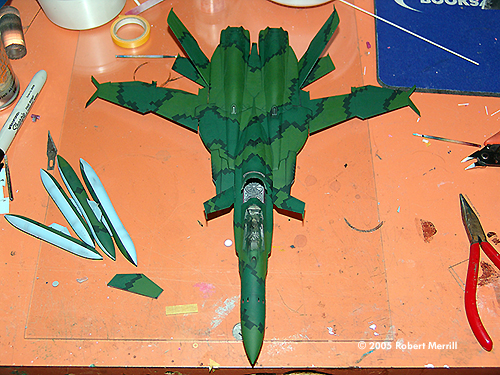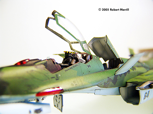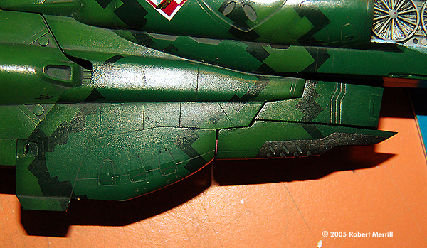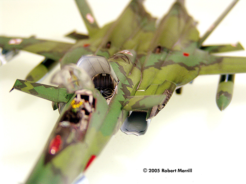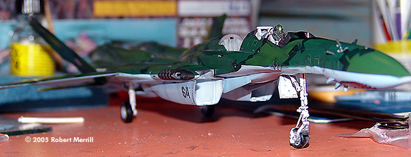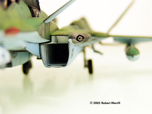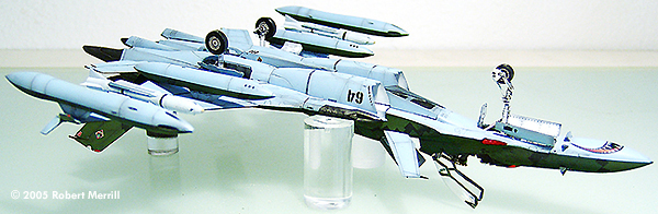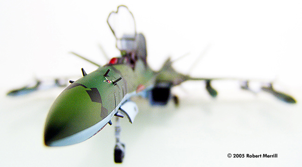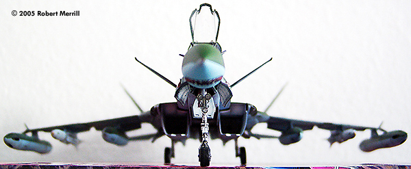 Final Assembly Finally, paint & decaling done, it was time to assemble. Fitting the leg/engines to the body posed little problem. I ended up not being able to glue the large gun into place as the fit between it and the legs are tight enough that it wasn't needed. The guns next to the intake had some small fit issues but trimming the mounting pegs a bit solved that. I also noticed that the insides of the gun mounts were unpainted. So much for my critical analyses of the plans to paint everything. Placing the exhaust/feet in place has some issues. The exhaust units have these little tab/spring things that need to fit into slots in the base. My guess is you have the choice of positioning the feathers in or out. Not the best system. It takes some careful fitting and wiggling to get everything in place. The wings came next. The left wing fit in easily, little bit of Tennax & some pressure and bamf! No seam. This, of course, meant the right wing was going to be an utter pain. And I wasn't entirely wrong. The dry fit looked good but when I adjusted the camber to match the left wing some gappage was revealed. Tried a bit of filing but I still had issues. Finally I gave up and made the best of it, figuring to try fixing the it at a later date. Tail surfaces went together fine but revealed some unpainted areas. Some touch-up solved that. Landing gear went in without any problems. I did wait until last to glue the front landing gear lights in place. Speaking of clear parts, I do wish that somebody would develop a more positive mounting system for the cockpit canopy. My best method is to glop on some Testor's Clear Parts glue and hope. Anyways, back to assembly. The only tricky parts left were the landing gear bay doors & the under-wing ordinance. With the exception of the two doors (I managed to break one of the mounting tabs off) everything went on fine. For some reason the big missile pods on the wing tips didn't want to settle down unless I trimmed off the mounting pins. Once I trimmed them off they went on well. Then suddenly it was done. Wow, cool. Then, in the midst of taking pictures I realized I hadn't put the front landing gear lights on. Now I was done. Finally. Conclusion In the end, I think this is one wicked looking aircraft. Assembly is well thought out and the fit rather good. The lack of detail in the landing gear bays is forgivable but I really wish they'd added in. Next time I may replace the position lights with little clear bits and trim the vent holes out. I also think next time I'll prime the model completely to help reduce the pink bleed-through. You learn something new every day. |