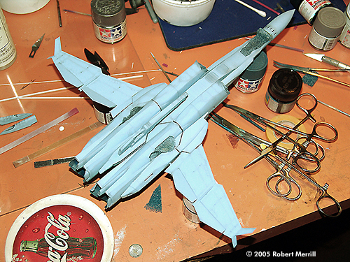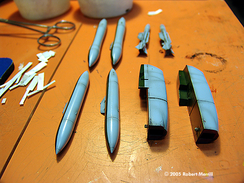 Sub-Assemblies Back to the build. I started just like the instructions say, with the cockpit. The cockpit goes together quite nicely, no big surprises. The real fun part was decaling the instrument panel. No less than 7 decals go on the panel, and while they snug down nicely with some MicroSol they are a pill to get into position. What I found handy was to lightly trim off the excess decal material on the areas where the decal might overlap. You can see my trim chart here. As I was building the cockpit I dry-fitted all the parts to the fuselage where I discovered a odd problem with this kit. The floor of the cockpit is also the base of the front landing gear bay and has some ribbing & fittings on it. My problem is that there is no detail on the inside of the fuselage for the bay. So you have the choice of leaving it plain and figuring nobody will see it, or adding some detail to it. I decided to just airbrush in some shading and call it a day. Or so I thought. The more I looked at those bare walls the more it bugged me. Unwilling to let it go, I finally decided to drag out the strip styrene and glue some ribbing on it. I used Evergreen .010x.020 strip, .060 C channel, and Plastruct 1.2mm T beams for the extra detail. Later I realized that doing this little modification was my downfall. Assembling the two fuselage halves showed two problems. The first was the somewhat loose fit between the upper & lower halves around the landing gear bay. You've got to be very careful about making sure everything lines up or you end up with a very tricky seam job. This leads us into the second issue; those little 6 sided plates along the sides. Be very light handed with the sanding or you'll easily wear them away. It's a shame, because they look so cool. I left off the canopy, VTOL jet cover, and little bits until later in the build to avoid breaking them off numerous times. Despite this I still broke off one of the antenna on the vertical stabilizers. The intakes do go together rather easily. The great thing is there is only a little strip that needs to be sanded smooth. The rest of the seams get hidden by the fuselage. I got to wondering, would Seamless Suckers ever produce a set of intakes for the SV-51/52? While waiting for things to dry I started looking at the wing assembly. Each wing has 4 parts, a pretty simple assembly. Then I thought about how cool the wings would looked with dropped flaps. Before I knew it I had started carefully cutting away the flaps & flaperons from the wing. I placed some 1.5mm half-round into the channels to fill the space up a bit. Then I used a small round file to cut a groove into the back of the flaps and glued them into place. Be careful to make sure the angle of the flaps don't interfere with the under-wing ordinance. Otherwise you'll have to break them off and reset them. Not that I had to do that (no I'm far too much the professional). As I started to dry fit the leg/engines I realized the main landing gear bays had the same issue as front bay, lack of detail. So out came the strip styrene again. This was easier than the front, largely due to the fact that I was working with flat surfaces and you could add the detailing before you had to assemble the parts. |