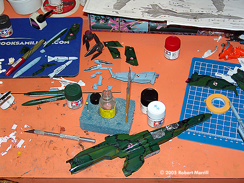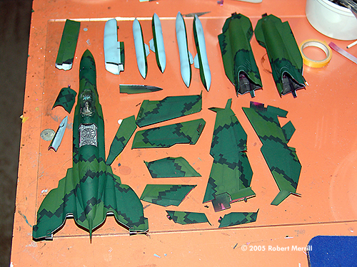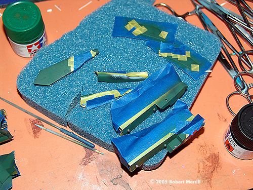 ^ I prefer to paint and finish sub-assemblies Image: Canopy masked, ready for paint. Image: The first layer of masking on top Image: Now for the lighter green Image: Painting the smaller parts Image: Painting, mostly finished Image: Some touch-ups were needed Image: Lots and lots of tape Image: Had some trouble with my home-made decals Image: Find the decals! Image: A light wash |