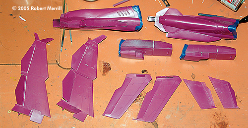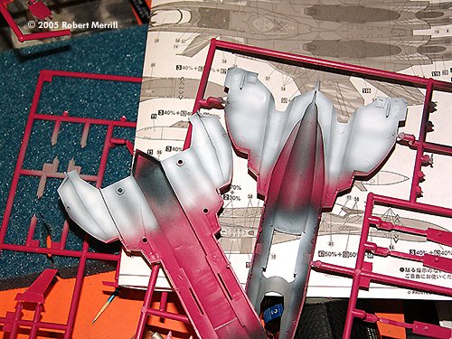 This just simply would not do. A nice aubergine I would have kept, but magenta is not an aircraft color to me. So, first things first, what color am I going to paint it? Digging through the reference books, consulting with John, and wandering the vast empty stretches of the internet looking for neet-o paint schemes I finally decided on the hard edged angular Soviet scheme used on some SU-27's. With that question taken care of I moved to looking at the kit, figuring out the sub-assemblies and what would go where & when. Then I looked at the instruction book and realized those were the feet and not intakes. This changes things considerably. Oh well. |