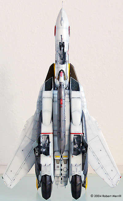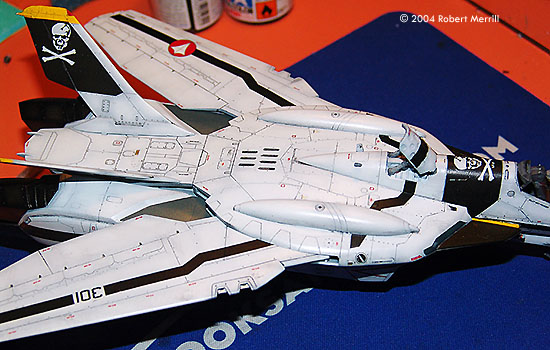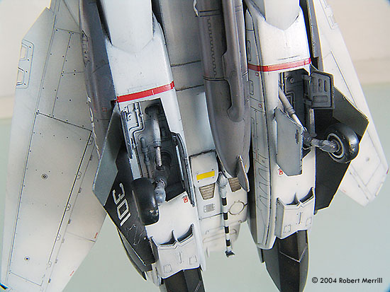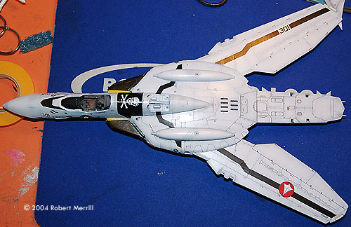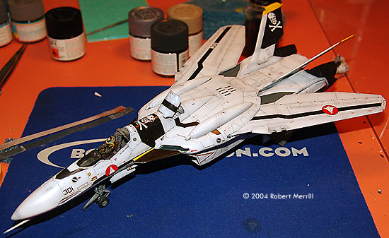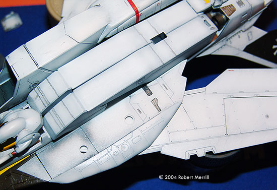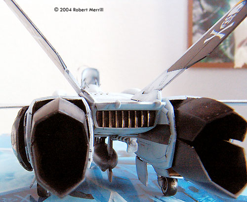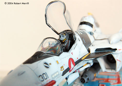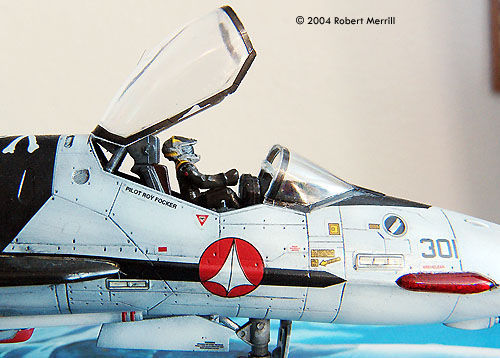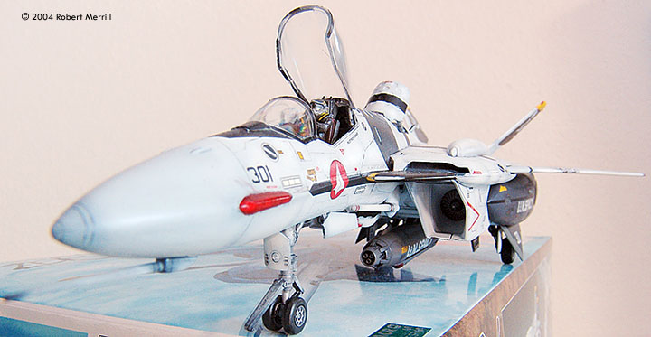 This would mean breaking the build down to modules to better facilitate the painting, but as it turns out the kit is made to facilitate this kind of a build. I'm going to try to go over this kit assembly step by step, where I deviate from the instructions and why. Bear with me, I'm new at this. Assembly Starting with the cockpit & figure (steps 1 through 5) you'll find that the tiny little 1:72 figure has no less than 7 decals; helmet crest, helmet visor, yellow helmet arrow, two paldron decals and two shoulder insignia. I never was able to get the visor decal to snug down but the rest went on without much of an issue. The cockpit is an easy build, parts went together easily and the dash decal snugged down perfectly. You will need to choose whether you're posing the canopy up or down when assembling the cockpit. If you want it with the canopy down you'll need to not install part #E1. I left off the HUD panel & the canopy until after I was done painting. The three part front fuselage had some minor fit issues where the small lower aft section mated to the lower forward piece. A little pushing & prodding brought it into alignment. I left off the landing gear and bay doors until final assembly to reduce damage to them. The landing gear has a catapult hook that it quite fragile. Don't worry too much about detailing the exhaust nozzles (parts K14 & K15) in step 6, as once everything is in place they're fairly well concealed. I, of course, gave them a wonderful 3 color paint job that will never be seen by anyone but me (it sometimes pays to look ahead in the instructions before you go overboard painting something that will never be seen again), I also left off the cable hook to avoid breaking it. In step 7 I'd advise gluing on parts A13 & A12 to A1 before closing it up, as that makes it easier to put some pressure on the parts for a smooth fit. You may also want to file the tiny blade antennas (K16) to a more airfoil shape as they're a bit on the blocky side. I left off the wings & tail surfaces in step 9 to ease decaling later on. Same went for the lower strakes in step 14. The leg/engine assemblies when together quite nicely except a poor fit between the main body of the engines & the top insert. I would also like to argue for a more positive connection between the leg/jet and the lower strakes. What you get is two incredibly tiny bumps that fit into equally small dimples in the leg/jet body. Problem is the strakes are so thin that there was no way I was going to attempt drilling a hole to pin it. What I did to figure the angle was to install the landing gear so that I knew how far I had to tilt the strakes out to clear the landing gear. Painting and Decals I pre-shaded the aircraft using black for the panel lines and a very light gray as the final color. The exhaust nozzles called for "Burnt Iron" but not having that I tried a "post shading" technique using Titanium Gold as the base color then going over it with flat black. You can see the steps I used here. In step 16 you're supposed to perform the final assembly, engines, arms, etc. Unfortunately if you do this it makes applying some of the decals impossible. So I put off final assembly until the decaling was done & the wash applied. After all the sub-assemblies were done, then came the gloss coat & decals. If decals scare you then the sheet that come with the VF-0S will probably cause you to curl up into the fetal position. Well, as somebody who has some difficulty with decals I'm here to tell you it's not all that bad. The decals fit is superb, which is quite frankly amazing given the complexities of the shapes they wrap around. First, as I've stated previously, don't fully assemble the model. Some of the decals have to be put on before the model is assembled (like the gray panels on top of the legs/engines), while other will be much easier to put on if you can lay them flat (like the wings and tail fins). Secondly, use some decal setting solution (like MicroSet & MicroSol); this will greatly ease getting the decals to lay flat on the model. And thirdly, don't over soak the decals. The best time is when the decal is just starting to be able to be moved on the sheet. If you soak it too long the film becomes very fragile and will break. Lastly, take your time, don't rush it. Weathering and Final Assembly Then, it was wash time. I tried something new here too; a pastel wash. I scraped some dark gray pastel chalk into water and smear the resulting sludge on the model, following the panel lines. Then a bit of water & some light rubbing and bampf! Beautifully washed lines. And best of all if doesn't look right, a little water will take it right off. My thanks to the guys on the Starship Modeler forum that suggested this. Works great. |