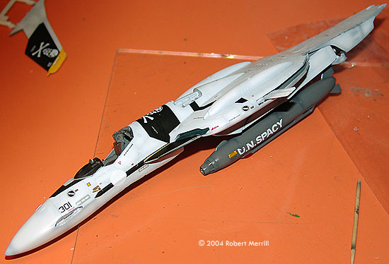 After the wash, I assembled everything (as in step 16, including the landing gear and bay doors that I'd left off earlier) but the clear parts, as I didn't want the semi-gloss coat to haze the parts. Then came a coat of semi-gloss (satin) clear, followed by the placement of all the clear items like the wing lights & canopy. A light dusting of white pastel to bring out the highlights and there you have it. A Macross Zero VF-0S. Sweet, eh? |