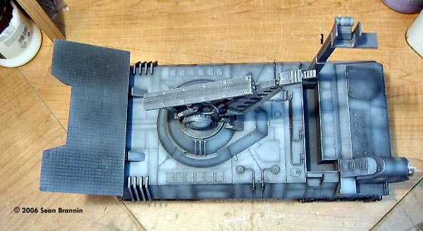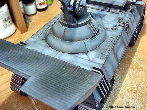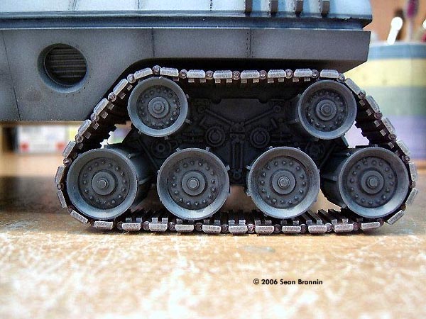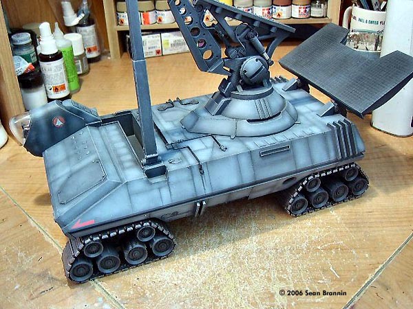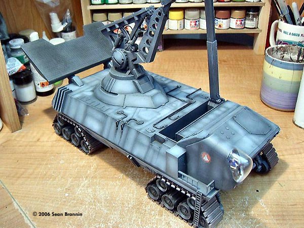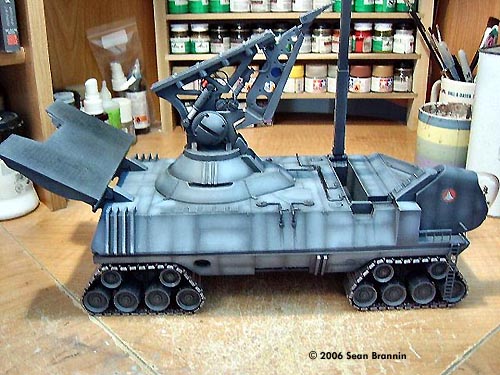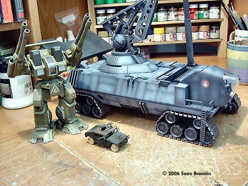 Back in 2004 John Moscato gave the model building community the Atmospheric Booster, quickly followed by the Launch Pylon for use as a display stand. It was planned at that point to create the Launch vehicle as well. Finally the model gods and the skills of Mr Moscato have joined forces once again to bring this rarely seen and highly sought after vehicle to life. Kit Breakdown My kit came in 64 pieces. The Launch Vehicle was made for sale individually so those who had the launch pylon already didnt have an extra pylon lying around. I didn't have a pylon so I bought one along with the vehicle. It is molded in a medium grey resin. The upper and lower hull halves are SOLID, and make up 80% of the kit's total weight. Detail on the parts is extremely delicate. The pylon as a kit itself is excellent and falls together with minimal cleanup. The parts are molded using a high strength resin to resist sagging over time from the weight of the Booster vehicle mounted on it. On the pylon are various hydraulic pistons and other details which scream for a good wash and drybrush session. The pylon base has wonderfully sharp details and excellent weld bead detail that really pops once painted and weathered. The upper hull is festooned with details, from heavy weld beads and extremely fine panel lines to various pipes and tubes which actually stand away from the hull. John made extremely good use of a 1/72 scale Warrior IFV to do some of the greeblies. Considering that the line art for the vehicle shows only a front 3/4 view and a rear view, the rest of it was fleshed out nicely and realisticly. Be extremely careful when you paint this kit since the scribed detail is light and can easily be clogged. The cockpit assembly has a little notch it fits into and is a wonderful little assembly. There is a seated crew figure, foot pedals, control chair , display and clear vacformed canopy that go onto its construction. The blast deflector is made of 3 pieces, The plate of the deflector is well detailed on both sides. One side has a reenforcing structure molded on it and the other side is scribed to represent heat resistant tiles. The Lower hull again makes use of the Warrior IFV parts for greeblies in recessed ares to great effect. There are various exhaust vents and little hatches running down both sides of the vehicle. The mount points for the track assemblies are very simple and lock in place with notches on the suspension. Track assemblies are broken down as a plate with the wheels and return rollers molded on which attaches to the back/mount for the hull, and a solid molded track piece which can be slipped on after painting. On the inside surface of the suspension there are 4 shock absorbers which are included seperately. Some of the track loops in my kit had cracked during shipping but were easily fixed with superglue. Once its assembled you begin to see how large this kit is. It dwawfs even a Destroid Defender in scale with it. Assembly is straightforward and cleanup is minimal. The larger assemblies all positively lock in place. All seams are along natural lines and no filler was required. Painting When I painted the Launch vehicle I base coated it in Testors Acryl Panzer Schwarzgrau. Once the base was dry the panel lines were postshaded with Tamiya nato black, the panels were then faded using PollyS Intermediate Blue. After thse colors had dried the details and panel lines were given a wash of Black and Burnt Umber artist oils and drybrushed with Intermediate Blue. The tracks were coated with Tamiya Nato brown for a base color then heavily drubrushed with Gunmetal and Steel to make them look like rusted metal which has been burnished on concrete. Conclusions This kit was very fun to build. It may seem a little pricey at first but once the parts are in your hands you begin to understand the time and effort that went into mastering it. This is a definite MUST for any macross or anime vehicle fan. If you have a booster kit, why not get a Pylon to display it on. If you have the booster and pylon why not get the Launch vehicle. It makes a very striking impression in the middle of any model collection. |