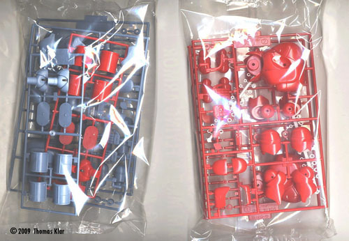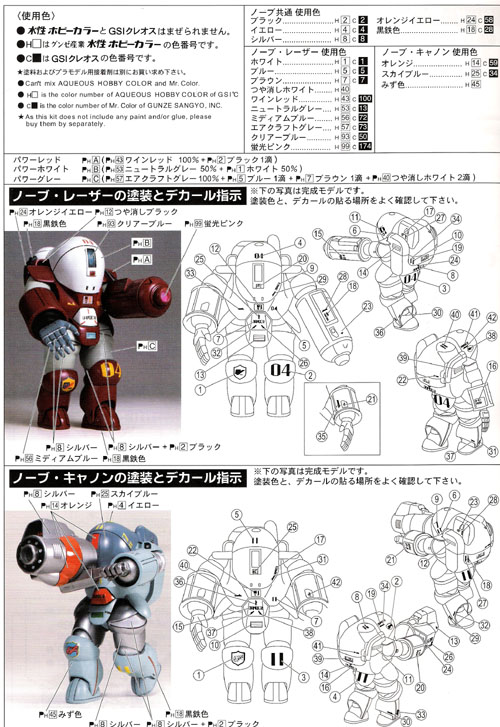 These include all the original kits as sets, partially with added weaponry, as well as new, so-called Hyper Dorvack kits, which are basically the old models with added parts as conversion kits. There do not seem to be single kits available from Aoshima, just the sets. But you still can find the original Gunze Sangyo kits on ebay (molded in 1983!) - these are just the same kits but single and with poor quality decals! I imported a bunch of these re-issued kits directly from Japan through an international internet store, since this kind of model kits hardly pops up at model kit departments, specialty stores or even comic shops, and started “business”. This PA-36 Nove Commander Powered Armor suit is part of one of these re-issued 2 model sets (a red/white one and a blue/grey PA-36 are included), and I decided to build the red one with authentic OAV equipment and livery, but in a “realistic” finish. What You Get The kit consists of about 50 single parts, molded in injected, red polystyrene (which is a bit brittle - other Dorvack PA kits in different material colors are more comfortable to handle), plus vinyl caps for moveable joints at arms and legs. All parts come in clear plastic bags. For both kits, a set of 2 different hand weapons is included, plus a spare hand if you want to build an unarmed model. Thanks to the vinyl caps, these can be interchanged. The production quality is very good, except for an infrequent, slight lack of material at the injection points between parts and mold channels, probably due to shrinking. This is easily mended with putty. This flaw appears only with the red material, though - the other PA-36 kit in the box, molded in bluish-grey plastic, does not show this problem at all. A small decal sheet with more than 20 (tiny) high quality water slide markings is included. Instructions with sequential B/W diagrams for both kits and their respective different weaponry add-ons in a comprehensive, 6-sided folder. Additional descriptions are only in Japanese, but you do not need them at all for assembly. The instruction manual also contains a painting guide (based on Gunze Sangyo colors) and color pictures of both assembled kits in OAV livery, plus detailed decal placement instructions on a separate B/W diagram. Further color pictures and illustrations on the box yield additional reference. Instructions are very comprehensible. Even though everything is in Japanese, you understand anything you need to assemble the kit. At one point you have to pay close attention not to confuse very similar parts. The paint guide is complete and accurate, but some model areas/perspectives are not covered and details have to be guessed oir improvised by box illustrations or legwork. Assembly and Enhancements This specific PA-36 kit was built right out of the box. The kit is a very good representation of the mecha, details are sufficient. |