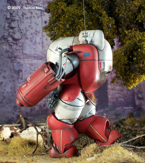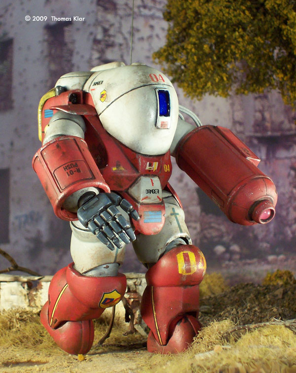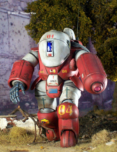 Assembly runs smooth. The parts basically fit together well and the kit is easy to build, even though its construction has some design flaws which have never been corrected during the 25 years of the molds' existence. Expect some putty work for a good finish. The main problem zone are the legs - step 5 and 6 of the instructions. Their construction and consequential building sequence makes assembly and painting very difficult: First, you assemble the feet, held together by the lower legs which are in turn held by the upper legs. While the parts fit together quite well and pose little problem, , this multi-layered shell from the bottom upwards causes trouble when you have to sand the parts and paint the (later) hidden areas between each step, in order to make sure you cover everything. Once the legs are assembled, you have a hard time reaching into the joint areas. The arms, on the other side, are comfortable to handle because they consist of separate parts that can be put together later through pivots and vinyl cap joints. But they bear a potential source for trouble, too. There is one moment in construction step 3 when you actually have to pay close attention: the assembly of the upper arms (Parts 5, 6, 14 and 15). Make sure not to confuse the pivot parts 5 and 6, because they look almost the same, even hold the same vinyl caps in the upper arm shell parts 14 and 15, but have minimally different diameters. You recognise the mistake either when the upper arm parts 14 and 15 do not fit together, when the arm does not hold onto the torso anymore (pivot part is too thin), or you cannot put the pivot into the lower arm section (pivot part is too big). Painting and Finishing As mentioned above, I wanted to build an authentic yet “realistic” model, so I finished the PA-36 in a fusion of the bright OAV colors with a weathered look from military duty. The choice of basic colors was tricky, since I only had the assembly/paint guide and few reference pictures. Gunze Sangyo colors are used in the painting instructions, but since I do not have them available around here I used a conversion table and Humbrol enamel colors for the hull's basic tones, plus water-based black ink and acrylic artist colors for weathering. After consulting the paint guide and considering many different red tones - ranging from deep burgundy through wine red to bright tones like RAL 3000 “Feuerrot”/”Fire Red” - I finally settled on a tone called “Insignia Red” (FS 31136, Humbrol 153). Even though it is still a bright and light color, this carmine tone has only little yellow hue, it appears a bit dull on larger areas - I did not want the PA-36 to look like a fire engine! What appears white on both “head” and upper arms is actually a very light grey tone. The painting instructions claim that it is a mixed color of a bluish grey (much like FS 36320) with white. I did not trust this, so I used a very light grey (RAL 7035 “Lichtgrau”/“Light Grey”, Humbrol 196) - pure white would have definitively been too bright. The upper legs were painted in “Pale Grey” (Humbrol 40), a grey tone that has little blue hue and matches with the red/white hull. All joints were painted in Aluminium Metallic (Humbrol 56). The visor was laid out with silver and covered with deep blue translucent paint. After a wash with black ink and some dry painting with shades of the basic hull colors, the whole kit received a sprayed matte finish - except for the joints and upper legs, which were coated with semi-matte varnish, applied with a brush. I used the complete water sliding decal sheet. The material and printing quality is very good -in contrast to the Gunze Sangyo decals of former times. Only problem (on any Dorvack PA) is the round surface on the knees, where the decals can hardly be applied at all. Here, patience, decal softener and delicate knife cuts helped, but wrinkles are hard to avoid. Finally, the PA-36 kit was slightly weathered with dry-brushed silver and finally received some dirt and dust weathering with acrylic paint in sienna, black and ochre. For the pictures of the finished model, I used a self-made diorama and a background poster of a house ruin, dented with bullet holes. Conclusions All in all a very convincing kit, even though it is pretty old and simple. Since it is easy and straightforward to assemble, I'd even recommend it to beginners and those who want to try their skills at giant robot kits. There are just one or two points to be aware of, but nothing that cannot be handled by an experienced modeller. Though it does not look very detailed at first, almost toylike with its poseable arms and legs or like an action figure - it is actually a very good representation of the OAV mecha. The price point might sound high (plus eventual transport and customs fees), but you actually get a set of 2 kits of the same kind in different liveries and with different equipment. Another thing that pleases me is the fact that you can actually finish the kit in very different styles - e. g. in a “clean” TV series outfit, with a realistic touch (like I did) or let inspiration flow and design your own paint scheme. These kits are also a very good basis for conversions (like the PA-58N kit from Clyde Jones her at starshipmodeler.com) - if you browse the web, you will find astonishing “fantasy” variations of the Dorvack Powered Armor suits! I'd recommend this one, either for the anime enthusiast but also as a basis for conversions. |