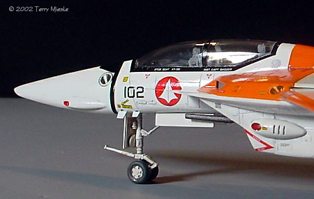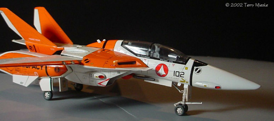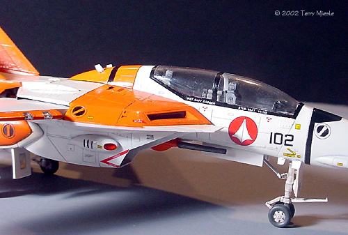 Only small amounts of filler were needed, I used mostly GS Mr. Surfacer 1000 to hide seams where needed. None of these areas were difficult enough to highlight here. There is a long strip of photo etch which is placed in the fuselage body to block the view into the interior. This isn't included in the base-model VF-1 kits. You will have to decide whether you want the wings to move, with the gearing mechanism, or use the photo etch. Since my Valkyrie would be displayed on the ground, with gear down, I opted to display the wings in their full forward sweep and place the photo etch strip where it belongs. There are tabs you need to bend inward, and then bend the strip to shape. I recommend you glue the center section of the strip in place, and then bend the outer sections. Test-fit with the wing in place, or you'll be in trouble later. Painting and Weathering I installed the canopy, and masked it with Tamiya tape. I also masked the thruster-feet to protect the Gunze-Sangyo (GS) Burnt Iron. I did coat the Burnt Iron paint with Future, to help resist pull-off when the tape is removed. The entire model was then coated with a mixture of 85% Flat White GS H11 and 15% Grey FS16440 GS H315. That's an estimate; I did mix an entire jar of this paint, to make sure I had enough for touch-ups later. This makes an off-white color which is not quite what the instructions call for, but the instructions indicate the lacquer GS Mr. Color paints, which I don't use - and are rare in the U.S. I'm happy with the color; it's a toned-down white. A coat or two of Future to protect the white, a day later, and I was ready to mask for the orange paint. This is straightforward, but tricky. The leg parts, especially, are not easy. Thin strips of Tamiya masking tape was used for those curves. Take your time, touching up afterward is not simple - believe me. The orange paint is the prescribed blend of 70/30 GS H14 Orange/ GS H4 Yellow. When liquid, the mix looked too yellow, but when applied, it looks great. This, too, was coated in Future to protect it, and prepare for decals. There are numerous black stripes on various parts of the aircraft. There are decals for all these stripes. I decided not to use the decal stripes for the canopy and the ring around the nose section. These, I masked and painted with GS glossy black. To me, this seemed simpler than the decals for these particular stripes. The trapezoidal black panel in front of the canopy is the decal; I didn't produce that via masking. After a coat or two of Future, I applied the washes. The oil paint washes are as follows. For the off-white areas, a lightened Payne's Gray was used. Black would be too harsh. For the orange areas, a blend of orange, black and burnt umber was used. The washes were targeted at panel lines and recesses. This is a training aircraft, and well maintained. Oil washes are allowed to dry, then excess pigment wiped away with a soft cloth, or in this case because the panel lines are so delicate, a cotton swab and my finger. I'm pretty happy with the washes; they're subdued and act to show the lines very nicely. The thrust-vectoring circular nozzles didn't hold the wash as well, and I used a disposable drafting pen to apply black pigment. I also used this pen to apply bold demarcations between white and orange along many of the surfaces like the leg/engine pods and control surfaces. Landing gear wells also received the gray wash, but much more heavily. Targeted Tamiya Smoke paint washes were also applied to landing gear doors, gear well recesses and wheels. The landing gear also received a brush-applied dullcoat of PolyScale Clear Flat. Oleo Struts and landing lights were painted with Testors Model Master Chrome Silver. |