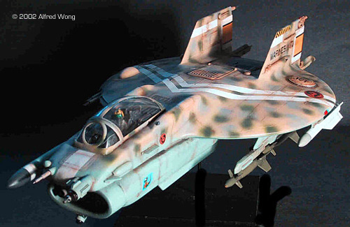 Details, details The stand out in this kit is the very nice cockpit, with Mr. Monogram-generic-jet-jock filling out the human element. All of the details can be seen through the nice, clear and massive vac-formed canopy. The bomb cradle pieces for the weapons bays were attached to a fairly heavy piece of resin backing, and would have been difficult to remove, so I simply ignored them, since I planned to have only one bay opened and the bomb load not extended. The thin parts such as the bay doors and dividing wall were badly warped in my kit, and the bay doors probably would have been better to have been provided as Evergreen styrene stock. Weapons The FS-21 is described as having 2 gun bays in the starboard wing, standard fit being a 3-barrelled plasma cannon and a rail-gun. The kit provides the tip of a 6-barrelled gattling-gun, (from the Monogram F-15, I believe,) which doesn't match the described weapons. I decided to put protruding aluminum barrels into both apertures. There are 2 stubby bombs from the old fictional Testors Mig-37 "Russian Stealth" kit, and a pair of very long missiles for the 2 underwing pylons. *Cough*--The less said about these long missiles, the better. Decals and Painting The decals have some very cool-looking dragon insignia, I presume representing some kind of clan emblem. They went on without problems. This model offers some real opportunities to flex the creative muscles in terms of painting and finishing. ![]() My Mods I decided to follow my mind's eye and make the FS-21 as a dedicated heavy-attack craft. It really doesn't look like it can actually dogfight anything! I added an extra set of pylons under the wingtips, and loaded her up for bear with an assortment of heavy bombs and ordnance. I didn't mind using slightly modified current bombs and missiles, since it just seemed logical that aerial free-fall bombs would not change all that much, and it just looked right. I used a pair of more substantial-looking pylons for the inner pair. I ended up using none of the kit's weapons. I decided to add an array of sensor upgrades to the nose, with very hefty-looking protrusions and housings. This also had the added benefit of drawing attention away from that horrid intake! Finally, I replaced the various molded solid lights (wingtips and fintips) with clear parts, since they were pretty prominent. Summary This is a nice kit of an interesting subject, to be sure. There are a few minor problems, but nothing major. It certainly is a cool addition to my 1/48 sci-fi collection. I can't wait to see what SSM's has in store next. |