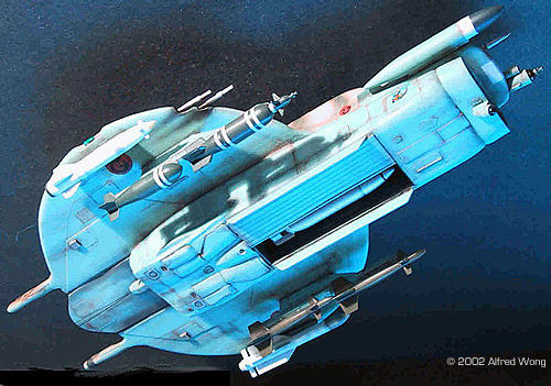 The craft looks like someone put an A-7 Corsair II, and A-10 Thunderbolt II and a Frisbee into a blender and gave it a good stir. From a purely aesthetic and design standpoint; the top half of the ship is very cool, with sleek lines and a coherent design from nose to tail. The bottom half, to my eyes, don't really look like it belongs to the ship. It is blocky and awkward-looking, ending abruptly at the rear and almost spoiling the whole design. In the description provided it says that the Shrike is highly maneuverable; well it doesn't look like it with that big box underneath. It looks more like a bruiser of a ground-attack aircraft that is rugged, packs a wallop, but ungainly. But that's just me. Actually, I would love to build another version WITHOUT the whole bottom fuselage. Hmmm…I wonder if I would get a discount for ordering half a kit…hmmm… Major Components The kit is dominated by 2 large and solid resin castings: The sleek upper fuselage, which is very nicely carved; and the boxy lower fuselage which was adapted from a Monogram F-18, complete with the wheel bays. The weapons bays have been integrated with the lower fuselage. The Monogram F-18 also contributed many other detail masters, including the undercarriage, small fins, weapons pylons and other assorted details. The molding quality is excellent on all the major components. I found no bubbles and just a minor mold seam line. My only complaint is that the scribing is too light and tentative. It was difficult to run a wash into them when weathering. The fit of all the major components were very good. The Intake The one major component I really did not like is the massive chin intake, which apparently, also holds a pair of short-ranged missile launchers! (The FS-21's designers just failed aircraft design 101! Can you say; massive engine surge and total flame-out?) The part is clunky with a way too-thick lip and doesn't even come close to matching the bottom fuselage contours. The detailing inside is too soft and indistinct for such a large part. This is a problem since it's such a prominent feature of the ship. In hindsight I wish I worked on it some more to improve its shape before I attached it, but I did add a bit more detailing inside. Undercarraige As mentioned before, the undercarriage are F-18 units cast in white metal. A nice touch is the inclusion of clear plastic rhinestones for the lights. The model is meant to have lowered landing gear, and the instructions tells the modeler to fill the wheel bays in with putty for flight mode. This is really not a good way to do things. Using putty in this way is a fairly advance scratch-building technique and the modeler shouldn't be expected to be put out that much. In my experience, in direct opposite to aircraft modeling where 99% of models have lowered gears, sci-fi models tend to have raised gears. |