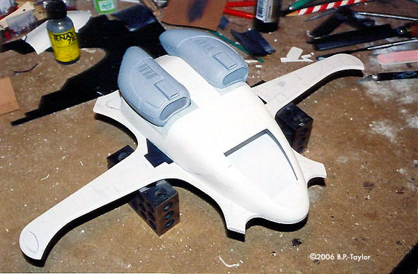 I gradually adjusted the trim line until it closely matched the contours of the main body, then I removed the forward area of the surround (leaving essentially a frame that exposes the clear bubble). I nested the clear bubble and surround together and with a Sharpie, transferred this shape to the plexiglas bubble. I carefully cut this area out (plus a sixteenth inch or so) then glued the clear bubble to the surround with plastic solvent. Because I wanted the canopy to be removable, I glued three small magnets to the inside of the canopy and drilled and glued corresponding steel pins into the main body. As a result of careful placement of the magnets, the canopy is self-registering. Finally, a few panel lines were scribed in, a couple of kit parts glued on and a half round styrene strip was applied not only to represent a canopy seal, but also to disguise any slight mismatch. I then masked off the clear area both inside and out to protect the plexiglas from primer and paint. Late Addition Just when I thought I was nearly done, I had another idea that I thought might add more visual interest to the Skimmer . Since it was now definitely a fighter, maybe I could add a couple of missiles or drop tanks to the underside of the wings. I never could decide which they were, but I added them anyway and they certainly gave it a more aggressive look. These were created in the same way that most of the rest of the Skimmer was made-carved renshape patterns and detailed vacuum form shells, while the wing mounts were made of styrene and plastruct channel. Final Finishing At this point I sprayed the Skimmer and its various subassemblies with a gray automotive primer, then began applying Nitrostan spot putty to any areas that required it. You may have noticed that this was done before the engines were attached as there were areas better dealt with without the engines getting in the way. With that done I finally glued the engines in place after first feeding the wires for the engine lights through the quarter inch hole on the underside. Final filling was done with more applications of Nitrostan and after another coat of primer; the Skimmer was ready for its base coat. The model was painted with Dupont Chromabase paints applied with a Badger automotive touch-up gun. I use this particular gun for the majority of my painting but I will occasionally break out the airbrush for the really fine or delicate stuff. Once the blue-gray basecoat was dry, I masked off and sprayed additional custom colors onto the main body and engines, red bands on the wings and a light gray for the interior. The dashboard and seat were painted and detailed, then epoxied in place. Next, custom graphics were applied, and sealed on with a matte finish. Weathering was kept to a minimum and was accomplished with black pastel streaking and some Model Masters steel to simulate paint chipping. A final light spray of matte lacquer sealed on the weathering effects and with that, the Skimmer was now complete. It did however require a display stand which I made of acrylic sheet affixed to an oak base. Before assembling the stand, a groove was milled into the acrylic into which the wires from the engine lights were laid. This groove was then filled in with quick-setting urethane resin, permanently embedding the wires, and when cured, it was sanded smooth and painted black. The Skimmer was mounted to the completed stand, with final wiring connections made beneath the base for a wall adapter that would provide power to the engine lights. The Skimmer was one of my entries in the Wonderfest 2005 Model Contest, where it was awarded Silver in the Vehicle/Mecha category. |
