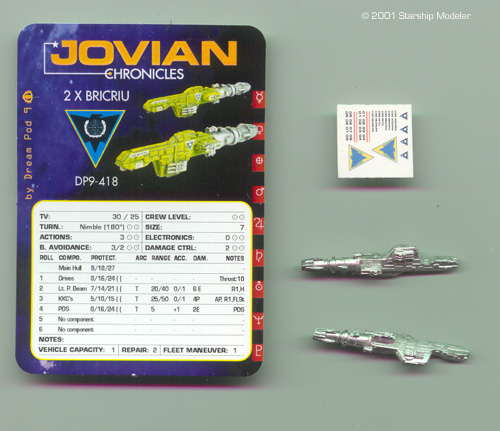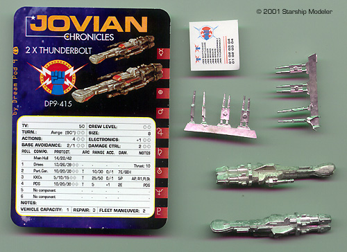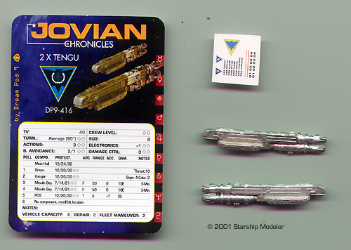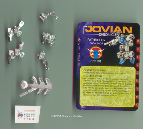 Books The recognition manuals, available for all three major sides, are a scratchbuilder's delight. Each are chock full of three view scale plans, perspective and cut-away drawings, as well as descriptive text. In addition to exo-armors and capital ships, interceptors, civialian ships and equipment for each of the sides are covered in succeding volumes. Also available, or coming soon, are source books for the minor players in this universe (like the Martian or Mercury forces). Many of the designs covered are briefly described at the Dream Pod 9 site. The Lightning Strike (2nd Edition) book collects and streamlines rules for game play contained in several previous books. Though the focus is explaining game rules, it also contains many vehicle drawings as well as sections on painting miniatures and making asteroids. Miniatures The Jovian Chronicles miniatures are what really catch the model builder's eye. Cast in either hard grey resin (ships) or white metal (exo-armor and smaller ship minis), they sport interesting designs and great detail for such small size. Though many of the exo-armors appear to be heavily influenced by Gundam and similar mecha designs (not that is in any way a bad thing) the ships are quite unique. Exo-armors, space fighters and other auxiliary craft are 1/500 scale; spaceships of any type are all 1/5000. Each blister pack contains one miniature (or two, in the case of the smaller ships), a small sheet of waterslide decals (that appear to be ALPs-printed), and a data card. Casting is nearly flawless; there are no pits or voids in any of the resin pieces I've seen, and the white metal pieces have a level of detail that's among the best in the industry, with very little flash or other imperfections. The decals are extremely sharp, and despite the small size the writing is quite legible. I have had zero problems assembling the ships, though the tiny kinetic kill cannon clusters threatened to escape my tweezers several times. The exo-armors I've built presented a slightly greater challenge, with arms and legs having considerable room for positioning and small (and I do mean small) gaps needing to be filled afterward. Similarly, the tiny decals can be a challenge to apply, not only because of their size but a tendency not to stick well (because they have so little surface area). Sliding them onto a drop of Future acrylic floor polish and then positioning them takes care of this problem for me (it's the same technique I use for tiny aircraft data stencils). For a look at assembled and painted minis, go here. Plans Also available are a series of plans depicting major combatants of the various fleets. These feature clear three-view drawings of the ships, plus technical data and operational histories of the class. If you wish to scratchbuild larger models of any of the Jovian Chronicles designs, these plans will be invaluable reference. Conclusion The Jovian Chronicles line features enough different spacecraft and mecha designs to be of interest to almost any science fiction equipment fan. Even if you don't play the game, the miniatures are fun to build and paint - the sort of project that can be done on a rainy afternoon with or without your kids. Highly recommended.Many thanks to Dream Pod 9 for providing the review samples. Manufacturers and retailers, interested in getting your wares reviewed and publicized on a site averaging 2000+ readers a day? Contact us! |