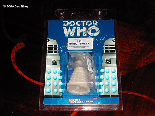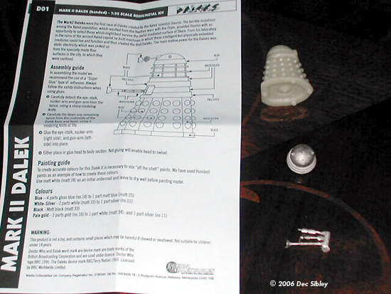 It is said that a fool and his money are easily parted, well thanks to Ebay its even easier, and I found myself bidding for these 1/35 Daleks with out a second thought. Made by Media Collectables I bought 3 in the end and paid about £20.00 for the lot (approximately $34.87), which I didn't feel, was to bad as they are no longer in production. (See note at bottom) One of these later went for £30.00(approximately $52.30) for a single Dalek so perhaps I got a bargain after all. This “in box” review will be brief as there is little inside the packaging. The scale means the model stands at 50mm tall when assembled. This is however one of the best things about these Daleks. Being 1/35 scale means that a whole host of military kits of vehicles or Diorama accessories can be used, something I'm already working on. What You Get The carton is a clear plastic bubble pack with the components visible, flanked by Dalek artwork. Inside is a sheet of instructions and the bagged up pieces consisting of a resin body a white metal head and grill plug and finally a small white metal sprue of 3 parts for the sucker, gun and eye stalk. |