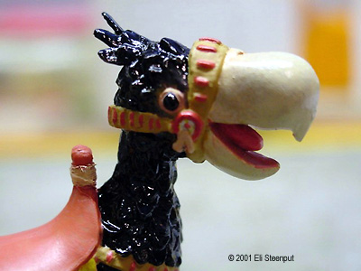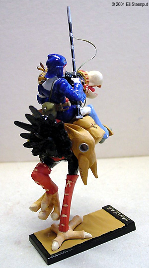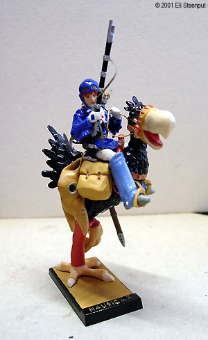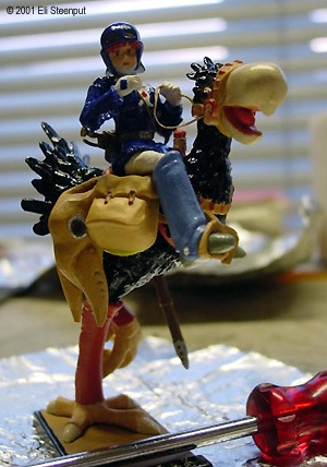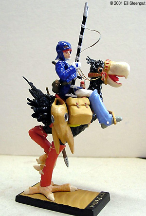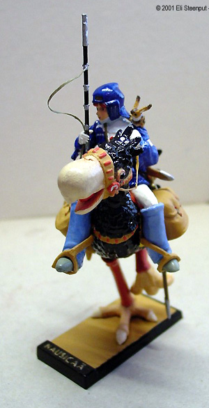 The Kit The model seems to be mostly based on this watercolor painting, with a number of modifications. The painting shows Nausicaä in a situation that does not actually occur in the story. The sculptor seems to have taken the pose and modified it to fit Nausicaä as she would appear between her joining the Tolmekian army and the battle of Sapata. In the model, unlike on the watercolor, she is wearing her modified Dork dress. I think the sculptor did a very good job converting a drawing into a model with a quite exciting pose. Note that in the drawing, Nausicaä's head seems twisted a bit too far for comfort, and Kai is missing a toe on his left paw! The only downside to the pose seems to be that that gun is in front of her face for most interesting viewing angles. The box claims the model is 1/20, but how they arrived at that is a big mystery. The finished model is about 11 cm from the 'ground' to the top of Nausicaä's head, so 1/1 would be (brief fantasy of a 1/1 scale version in the front yard) 220 cm with Nausicaä herself about 1m30, which seems a little on the small side. The model seems fairly accurate, about as accurate as you can get to a manga character - unfortunately, Miyazaki is not always consistent in his drawings, and usually not in his use of colors. Construction The kit has 36 plastic parts on 2 sprue trees. The instructions are completely in Japanese but construction is relatively straightforward. The box art choice seems unfortunate, as it shows a very atypical color scheme for Nausicaä. There are two *very* small tiny photographs of a finished model on the side of the cover. I suppose the (Japanese) instruction refers to the box art for color selection, but I had my own ideas on the colors anyway. The parts on my kit had fairly large amounts of flash, but most of it is relatively easy to remove. Most seams or sprue connections are in easy to smooth locations, and as the kit represents living matter it is fairly forgiving. The sword as shown in the instructions has an inaccurate (too short) handle. You will have to sculpt part of the sprue to get the correct handle length. There are supposed to be buttons where the sprue connects to Nausicaä's ankles, so don't be too enthusiastic in smoothing this area. I started with the gas mask and Kai's body. I cut out the eyeholes on the gas mask and glued bits of transparent plastic in place (not easy since the holes are not flat circles). I painted Kai completely before attaching the standing leg, to more easily paint the legs' details. The fit of most parts for Kai is more or less OK except for the feathers on the head and tail, and the toes on the standing leg, which required several layers of liquid cement and filing to hide the seams. Any misalignment is easily camouflaged among his feathers. I wound some dental tape around the saddle horn as all references show something wound around that part. I regret not hollowing out Kai's beak before gluing his head together, as I think it would look a lot more realistic. The saddle blanket is almost completely covered in the finished model so I might have saved myself the trouble of painting it. There are various holes on Kai's body to attach saddle bags and other hardware. Fill them up and forget they were ever there. They will NOT help you. I then started on Nausicaä. The 'visor' part is so ill-fitting that to install it would require lots of sculpting on the head. At this stage I didn't feel like doing so. It should probably be integrated with the head before any painting is started. My biggest mistake was probably to view Nausicaä and Kai as two separate models to build and then combine. Fortunately, I test-fitted Nausicaä on Kai before the glue for her legs was completely dry. It may be smarter to glue her in the saddle before attaching her lower legs. I thought the upper edges of the leggings were way too sharp, so I rounded them with a file. The stirrups will not fit no matter what, so just accept you will have to lengthen them and try to find the best fit for Nausicaä in the saddle without worrying about the stirrups. Also don't pay attention to the indicated location of the saddle bags. Add them in a location that seems natural to you after fitting Nausicaä in the saddle. I was able to twist the left leg to make the left stirrup more or less match, but this made the saddle bag position impossible. The right stirrup had to be extended, for which I cut a bit of toothpick to shape. Note that the bags will cover most detail on Kai's saddle blanket and the back of Nausicaä's leggings. I moved both bags higher than indicated, and the one on the left had to move to the rear. I attached all the bags only after fitting Nausicaä in the saddle, which I think saved me much grief. You could of course decide not to add any bags, gas mask, Teto... Nausicaä on the base will have a tendency to fall over backwards. I glued a 2$CDN piece to the underside of the base, in front, and it seems sufficient. I may add a wood base later when I happen across a suitable bit of wood. Colors I usually mix my own colors, so I cannot give accurate color descriptions. I used Revell paint in gloss black (7), white (4), silver (6), night blue (51), Ferrari red (31) and yellow (12), and matte white (5), ochre (88) and skin color (35). I also used some leftover gold-colored household paint. For Kai's harness, which likely belongs to Yupa, I selected a color scheme of red and earth colors. Kai is shown in most color pictures with either black or blue feathers. I choose to ascribe the blue to the average water color painter's aversion for black. I painted Kai's feathers in gloss black with night blue highlights, and the rest of him in various mixtures of ochre, gloss white, Ferrari red and yellow. Nausicaä herself dresses mostly in white and blue. The Indian-style Dork dress was originally red and knee-length, but after Nausicaä's attempt to rescue a wounded Ohmu, it was colored a very distinctive bl