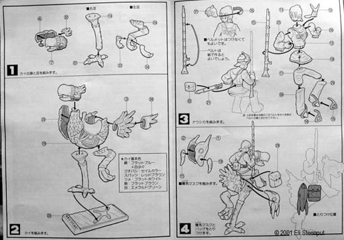 Image: Though all Japanese, the instructions are useable Image: Kai, partially assembled, with modified gas mask Image: Kai's head Image: Nausicaä, in pieces Image: Her body is now complete Image: All the various subcomponents completed Image: Teito and the sword Image: Reins being added Image: Close-up of stirrups Image: Teito and sword added Image: All the details fitted Image: Front view, completed model Image: Rear view, completed model Image: Front, left side Image: Nausicaä's front Image: Nausicaä's back |
