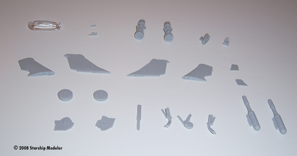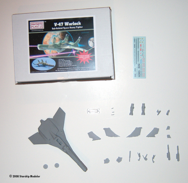 In 2007, Fantastic Plastic Models invited the model building public to design an original, futuristic starfighter that could be made into a 1/72 scale model. Of the almost 200 submissions received and voted upon by the masses, Vic Rinaldi 's V-47 Warlock design -- a dual-purpose (atmosphere and space) one-person fighter - was the clear favorite. This year, Fantastic Plastic commissioned a master pattern of the design and this kit is the result. What You Get Inside the standard, sturdy box are 25 resin pieces, an ALPS-printed waterslide decal sheet, and two pages of instructions. The resin includes one water-clear canopy, and the option to pose with landing gear down or retracted (though no base or stand is provided for the latter option). The resin pieces, patterned by Scott Spicer and cast by BLAP! Models, are exquisitely rendered and superbly cast. And I don't use those adjectives lightly: both pattern maker and caster are amongst the best in the garage kit business. Mold seams, flash, pits --- all are negligible, though there are a few pour stubs that will have to be carefully trimmed away (the largest of these is on the main fuselage, where an engine should cover the spot later in assembly). Detail is crisply rendered, straight and symmetrical. I had to really look closely to find one or two scribed lines that did not quite meet up (and that's a trivial matter to correct). I prefer clear vacuformed plastic canopies - but this resin one is pretty good. It is pretty thick, and as a result is not completely distortion-free, but you should be able to see any detailing you add to the cockpit with it in place. Any such detailing, by the way, will have to be scratchbuilt; aside from the seat, the whole “office” is pretty Spartan, without even decals for the consoles. Think of it as an opportunity to excel. |