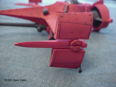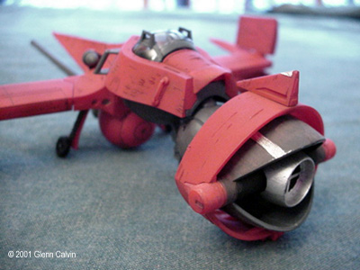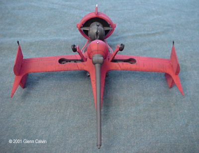 In addition, I used several of the above colors to make a very thin color wash that turned out being a very reddish brown that was just a bit darker than the base color of flat red. I applied the wash AFTER using the Gundam marker on the panel lines (simply smearing off the excess for that "dirty" look) and AFTER battle damaging the hull. This allowed the wash to settle into the scars. I simply wiped the excess wash of with my fingers (again for that "dirty" look). After the wash had dried, the flat red color coat was sprayed onto the various hull surfaces. This toned down the "dirtyness" to make it look a little more realistic, I think. I tinted a clear plastic canopy for the first time with this kit. I used Tamiya Smoke X-19 through the airbrush on the INSIDE surfaces of the canopy. It turned out pretty darned good for my first time. Next time, thinning the smoke 1 to 1 with denatured alcohol might make it come out a bit clearer. It really didn't turn out as dark as I thought it would, but it's a nice touch that adds a little bit of realism to any project. The main problem that I ran into during this project was that the diagram that shows the wing hinges (for the ship's folding wings) DOES NOT SHOW that they are slightly different lengths. It probably tells you that in JAPANESE. Oh well. I installed the long one into the wrong wing and vice-versa, so when I went to attach the wings to the fuselage, the fit was off by about 1/4". I ended up having to cut the hinges and permanently glue the wings in the extended position. I only made one other (dumb) mistake with the kit in that I forgot to install the landing gear prior to gluing the two fuselage halves together (D'oh!). A little trimming to the landing gear struts and some glue fixed that problem. This is a fun kit that should be okay for the beginning to intermediate sci-fi kit builder. However, it has excellent potential to become a fantastic looking completed kit in the hands of the expert builder as well (with a little bit of extra attention). A kit preview by John Lester is also available here. Additional Images: |
