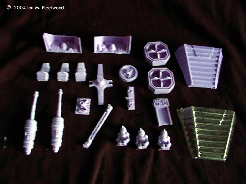 ^ Top hull half Image: Top/rear of upper hull half Image: Closer look at engine detail Image: More detail Image: Detail in the "trench" between the hull and wing ^ Bottom hull half Image: Rear of bottom hull half Image: Detail Image: More detail ^ Wings Image: Wing top Image: Underneath Image: Detail pieces Image: Cylon figure |