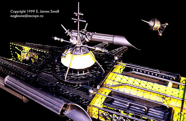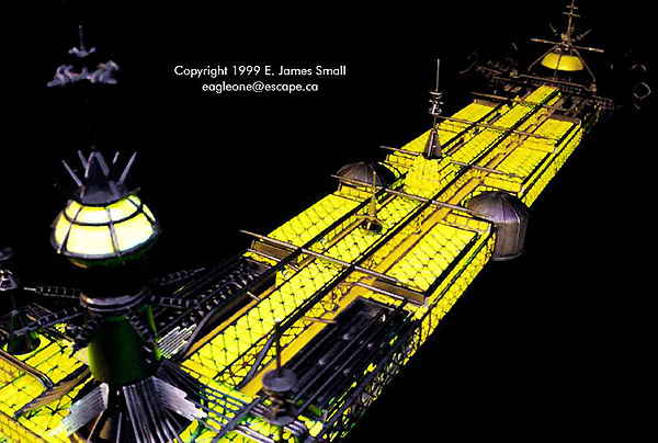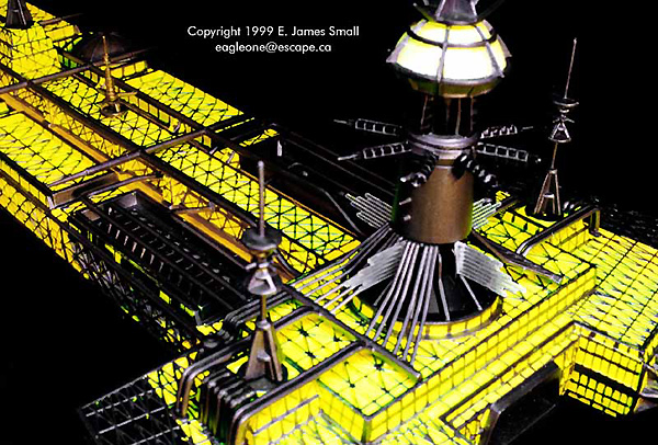 | Now came the gruelling part. This is the reason we model makers know when we are passionate about our craft. This is what tests our mettle, and questions our sanity. The most intense, boring, frustrating part of all was painting all those thousands of individual girders that completely cover the entire model. What's worse, only about half of them are molded in! I had to paint not only the molded details, but also all the girders on the sides and angled parts of the structures where no molded detailing exists. You can only do so much of this between long rests! However, after a few days work (and many glasses of adult beverages consumed), the girder work had it's required coat of tediously applied paint. Now the final assemblies could be done.. FINAL ASSEMBLY Take my advice. If you build this model, take the flimsy and totally useless "display stand" that comes with the kit and give it to someone you hate. I built a new stand from scratch that was much more robust from wooden dowels and rugged plastic boxes and a heavy base at least as wide as the ship. After you've got the model mounted to a reliable support, you can glue on the rest of the bits as per the instructions. I added a couple of extra tubes to the ends of the mid-fuselage section for a bit of added life. I photographed the model you see here under black light, which is a dandy way to display it in a darkened room too! I also had a bit of "regular" incandescent light present to highlight the non-lit areas of the model. If you want to use black light, don't buy those standard black-light "bulbs" that are sold in novelty shops. Those damned things get so hot that they'll melt your model from ten feet away. They are incandescent too so the amount of ultraviolet energy they produce is almost zero. Spend the money and get a fluorescent tube-type black light like you've seen in your neighborhood bar or dance hall. You've spent all that time and money on your model, why not a few extra bucks to display it properly! One word of caution: I know it looks cool in the daytime, but don't leave your model in direct, or, bright indirect sunlight for long. Fluorescent paint has a nasty habit of fading like crazy if left in sunlight for too long. One day of "fun in the sun" could ruin all your work. CONCLUSION Building this model was intense, nerve wracking, sanity testing and gruelling, but above all it was satisfying! It was also a lot of fun, as it's certainly one of the most challenging models to try to reproduce from a kit that I've worked on in a while. Editor's Note: According to an eMail from Brian Johnson,"According to an ex-Disney employee, the model was stored in a crate in the 'Boneyard', where old props and such are stored on the Disney lot. It was rained on a great deal, and, one day, smashed to pieces by a poorly-driven forklift which accidentally backed into the crate. Pieces of the model were taken by various folks as souveniers." |