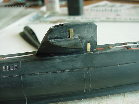 Image: Engraving & putty, aft half Image: Bow, under construction Image: New doors on the sail from scrap PE ^ New details on the top of the sailImage: Completed sail Image: Stern Image: New Flying Sub hatch ^ Closer look at the "picture window" |