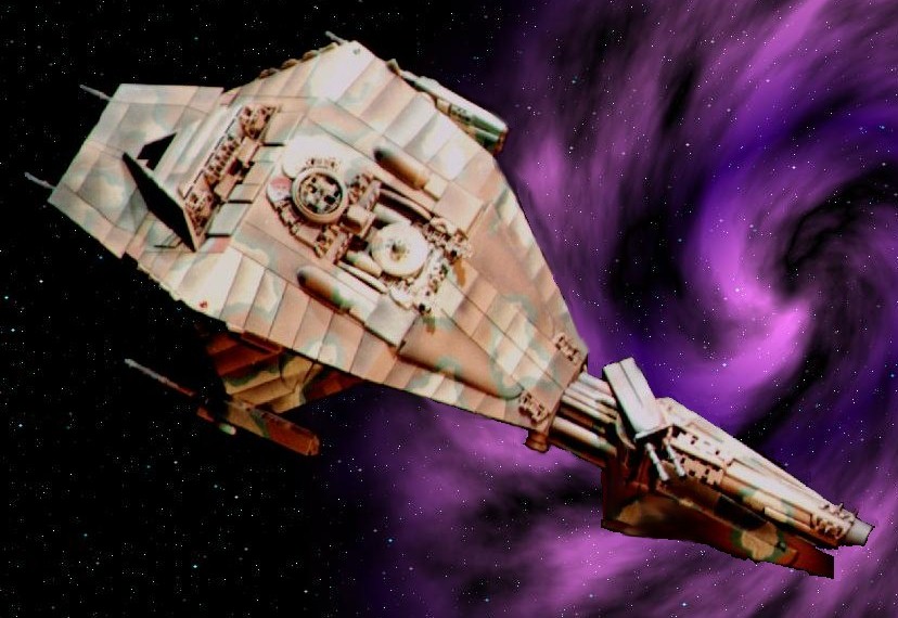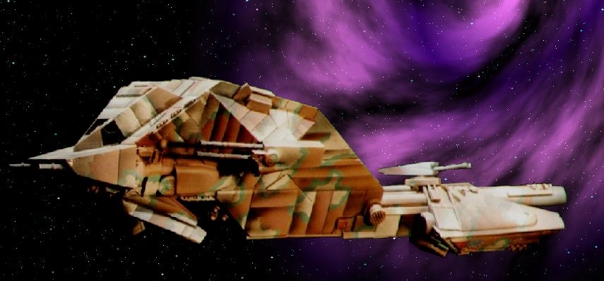 | By John Douglass - images and text © 1997. This ship actually started off as something quite different. It was originally supposed to be a very large freighter facing the other direction. It languished unfinished (alas, a not uncommon fate) until Shadows of the Empire, the LucasArts game, rekindled an interest for me in smaller potential "bounty hunter" craft. Anyway, in construction it is fairly typical for me. I started with two sheets of .060 styrene (plasticard). I cut one to look like a thick, stretched-out "Z", cut the other to match, joined them along the bottom, then plated-over a couple of the upper surfaces, forming what looked from the front or back like a fairly thick wedge. The nose was another wedge. I glued the front edge together, plated-over the sides and back, then sanded-off (with my disk/belt sander) the front edge. The wide part of the top of the ship would look really silly if I didn't put something on it so that it would look like it was wide for a reason. So, I put wedge-shaped "shoulders" on it, from which stuck-out wings. That was on the original freighter, anyway. When I picked this ship up again I plucked the wings, tucking them instead under the "chin". If you squint just right the ship looks kinda like a prehistoric fish from the side. Yes, even when sober. Well, sometimes. Anyway, the shoulders needed an excuse to exist again, so I made them turret mounts. Most ships have vast expanses of relatively little detail, with a few areas, usually nooks and crannies, with lots of detail. In order to make the top less boring I "indented" a square section of the top, then packed it and the surrounds with some detail. Enjoy playing "pick the parts"! The rationale behind the finish was I wanted a lander that was one of a large contingent on a carrier-type vessel. This particular lander is camouflaged for a, well, brownish-green planet. What doesn't show in the photographs is that some of the panels are painted solid colours (look toward the rear on the side view), *and* in a similar camouflage pattern done in red and light-blue! As always, the variety of colours add a bit of interest to the ship surface, and (hopefully) lend a bit of reality to the subject. | Click on each image to see a larger picture - but be aware, these are BIG! ![]() Side View of Mantee-class Assault Lander. ![]() The essential wedge shape of the nose and the body shows up better here. Note, too, all the detail parts fetching-up into the joints between the various major components. ![]() Top view - look at that detail! |