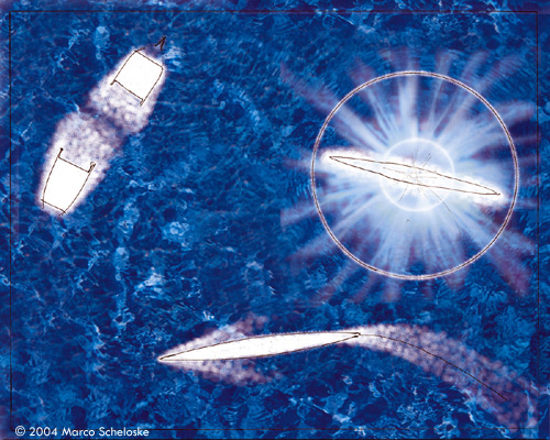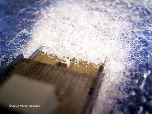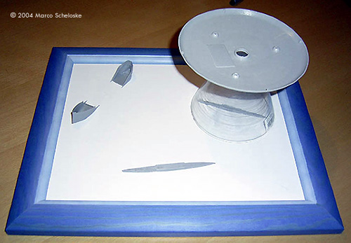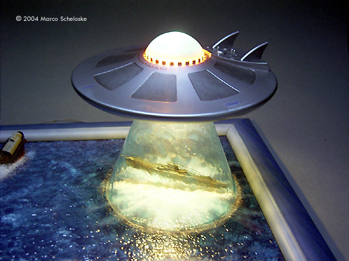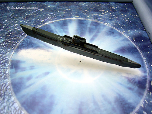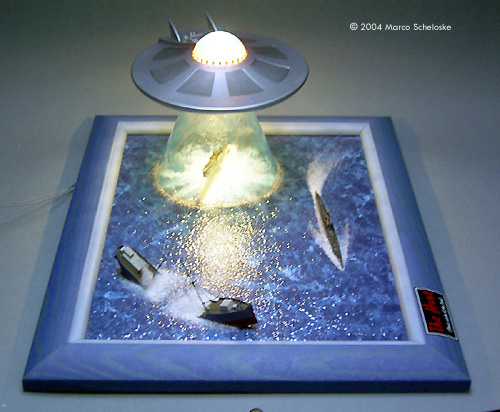 I saw a nice little model kit in that one, a set with two german WWII submarines and a sinking freighter, broken in the middle of its hull, in 1:700. It was cheap, so I purchased it, not having any special plans or ideas with it. I got it "just in case". Not much later, via eBay, I got a kit from a German model railroad supplier, "Busch": a classic-shaped UFO saucer which included a complete lighting set. I`m not very experienced in electronics, so such complete ones are a nice way for me to light up a model. Normally, anyway... I didn`t have a plan for this one too, but I definitely wanted to show it in a diorama, not as a stand alone model. I remembered the submarine set I own, and slowly but surely the idea for the complete scenario came to me: The freighter, obviously torpedoed by the german boats, and the UFO, obviously catching one of the grey wolves while the other one is withdrawing. Cool! With the lights it should look great, and be a bit humorous although dramatic at the same time. Should even be easy..... ![]() Getting Started I started with a rough layout of the vessels involved, then I searched for a suitably-sized picture frame to use as a frame for the scene. So far, so good.: I found a nice blue frame in the desired size quickly. Now I built the freighter and the submarines. They went together well. I painted and weathered the sinking ship and the withdrawing boat. Still everything is ok. I made an underlayer picture representing the area of the ocean in which all this action will happen (the Bermuda Triangle, for instance?), including some white foam and tractor beam effects. Following that I cut the seafilm for the surface. No problems. Seems to be a perfect project - so far. |