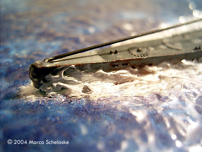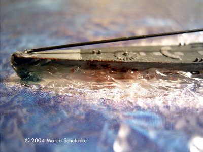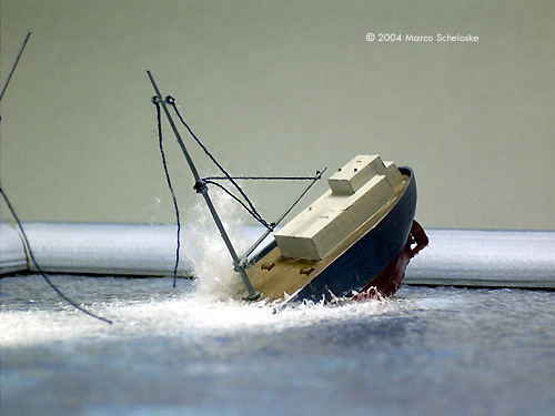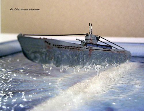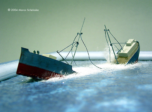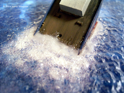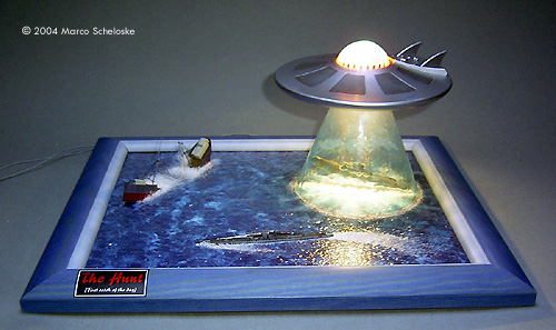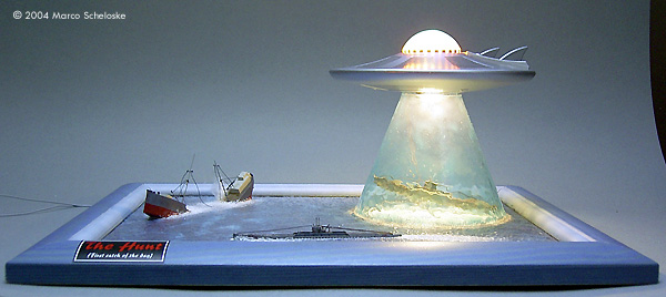 Finally I masked the clear parts and painted the UFO aluminium with some details in Citadel's Bolt Gun Metal. A few alien decals are also attached, and the flying saucer was done. I don`t paint too much details to get that "golden age" look. Final Bits Time to put all parts of the dio together. Two small holes were drilled into the base for the power supply wires, then the sinking ship and the withdrawing submarine were glued in place. A short clear acrylic rod was attached to the tractored boat so that it will later look like lifted out of the sea. Water effect gel was used to create the water that flows back as well as the waves and foaming water around the sub and the sinking freighter. That stuff dries clear, so I drybrushed it flat white a day later to make it look more real and to bring out the detail. Now I glued the "tractor beam" and the UFO on the dio base, added the masts and destroyed rigging of the freighter and soldered the wires of the UFO to longer ones which will be attached to the power supply. The nameplate was printed and glued onto the frame - voila, "The Hunt" was done! And do you know what I was asked several times at the contest? "From which movie is this? I don`t remember that scene, but it looks cool." It's a great feeling... |